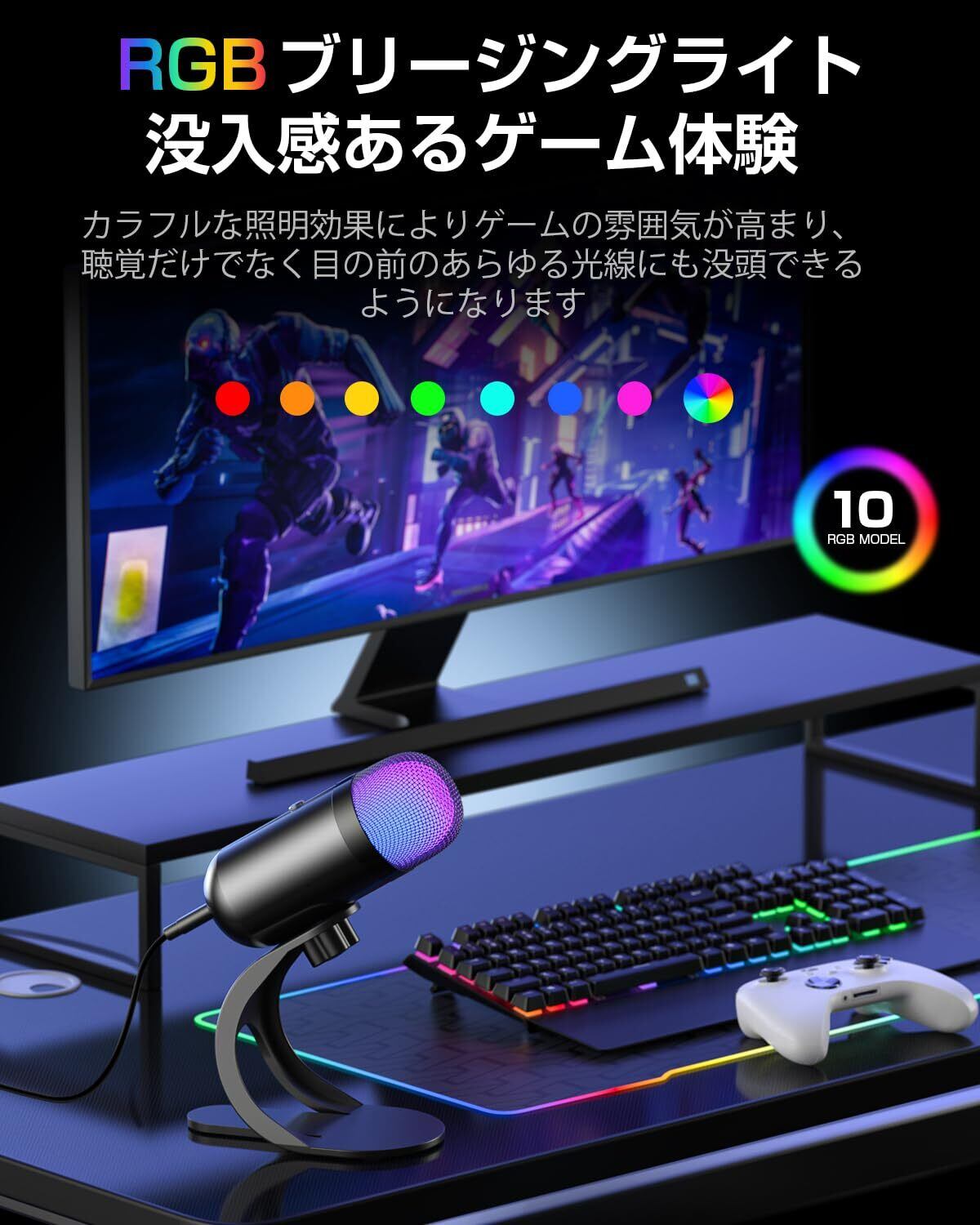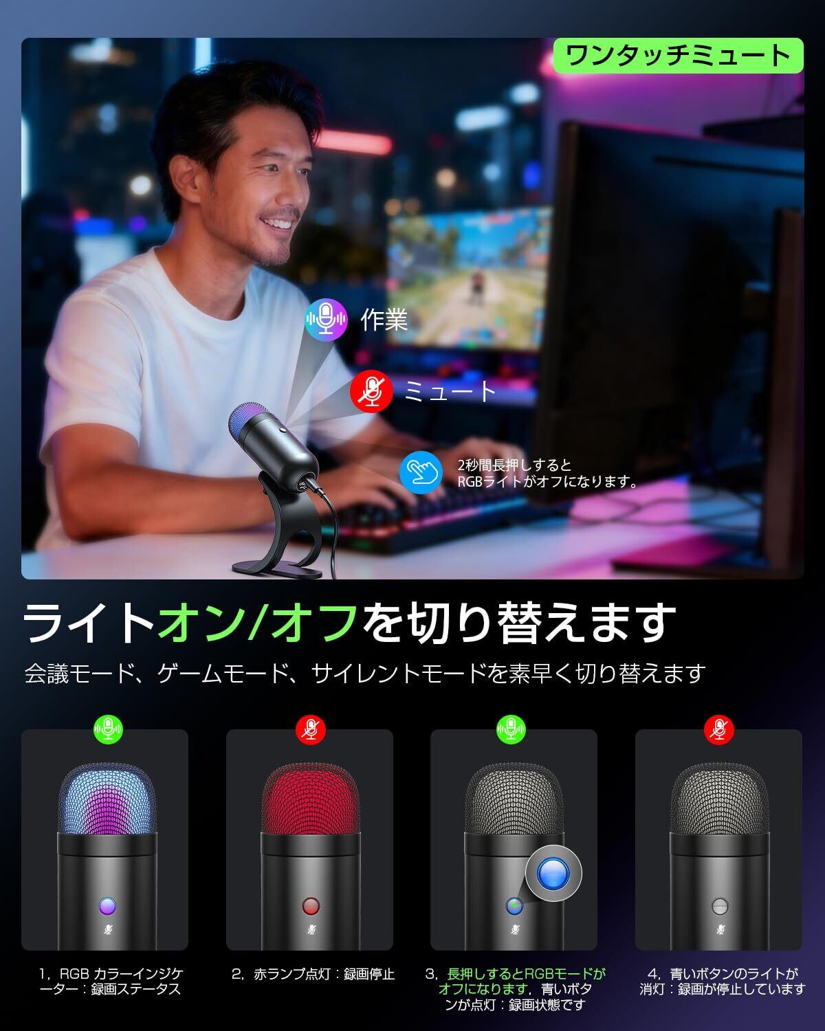【RGBライティングオプション】RGBライティングには2つのモードがあります。電話会議中は、ボタンを2秒間長押しすることでRGBライティングをオフにできます。ボタンが青く点灯しているときは録音モード、消灯しているときはミュートモードです。ゲームやライブストリーミング中はRGBライティングをオンにできます。ミュートモードでは赤く点灯し、通常の録音中は鮮やかな色に自動的に切り替わります。ニーズに合わせて様々なモードからお選びいただけます。