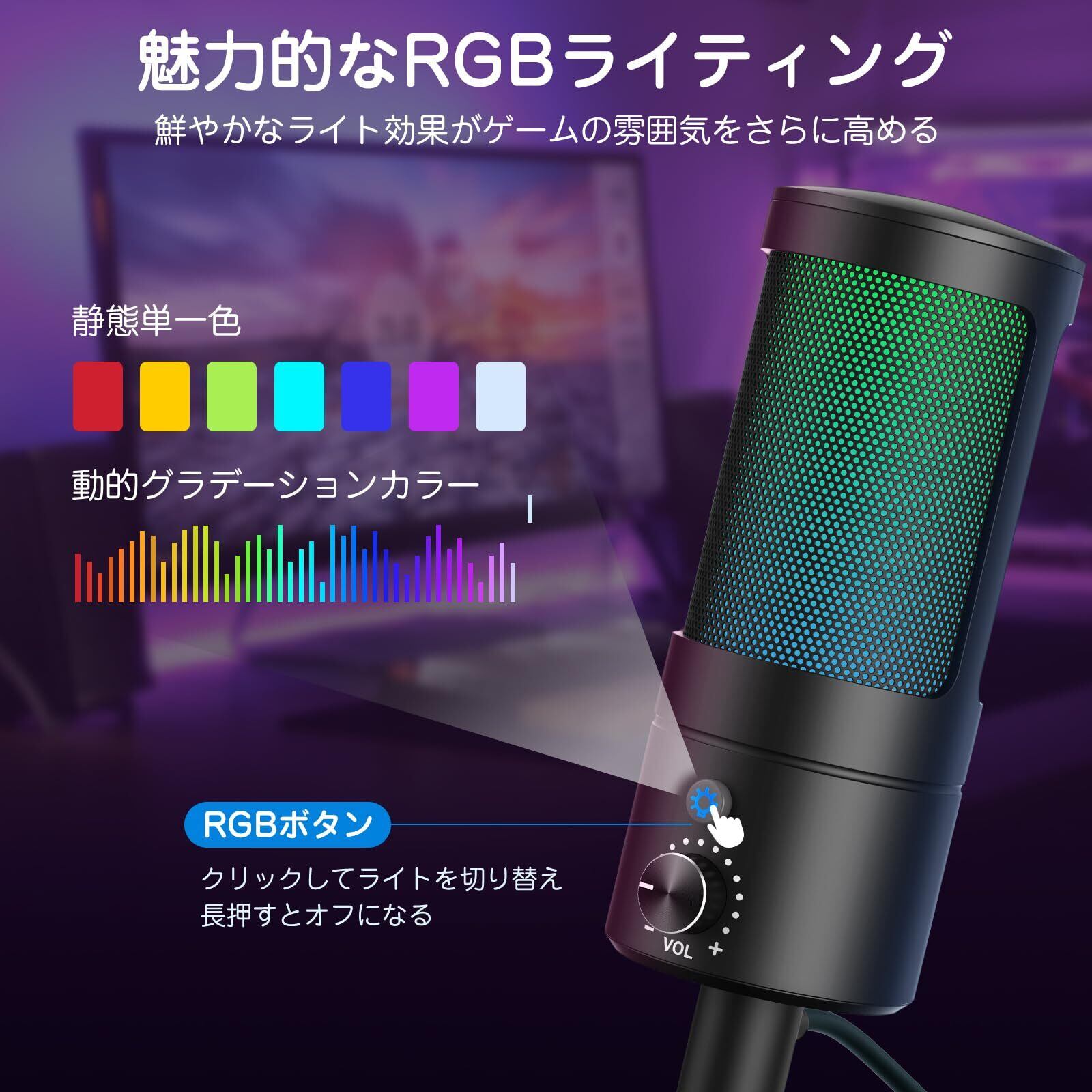 【超魅力的なRGBライト&ワンタッチミュート】 A30マイクには複数の静態単一色と多色の自動グラデーションRGBイルミネーションが内蔵されており、さまざまなスタイルの場合にマッチングことができます。柔らかくで名を引くのRGBライティングは、ビデオやライブ配信で画面を活躍し、ゲーミングセットアップと調和のとれた色効果を生み出します。また、押しボタンの代わりに、マイク上部のタッチセンサーがあり、ミュート/ミュート解除を一瞬で切り替えて便利です。ミュート機能は直感的にRGBライトで表現されます、マイクがミュートされるとRGBライトがオフになり、誤操作を低減します。
