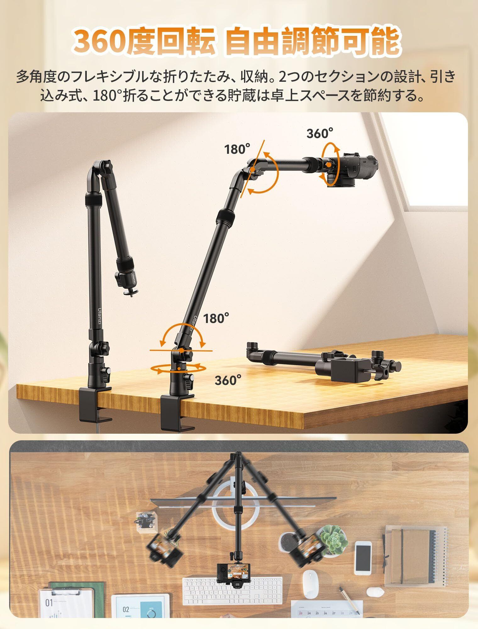 Ulanzi ZJ02 カメラアーム スタンド 俯瞰撮影 卓上 撮影スタンド 109cm 4段階伸縮式アーム 1/4ネジ付き ボール雲台360度回転 自由調節可能 アルミ製 2kg耐荷重 安定性 収納快適 省スペース スマホスタンド アーム LEDライト/マイク/Webカメラに対応 ビデオカメラ キヤノン YouTube/TikTok/vlog/ビデオ会議/宅録生放送用