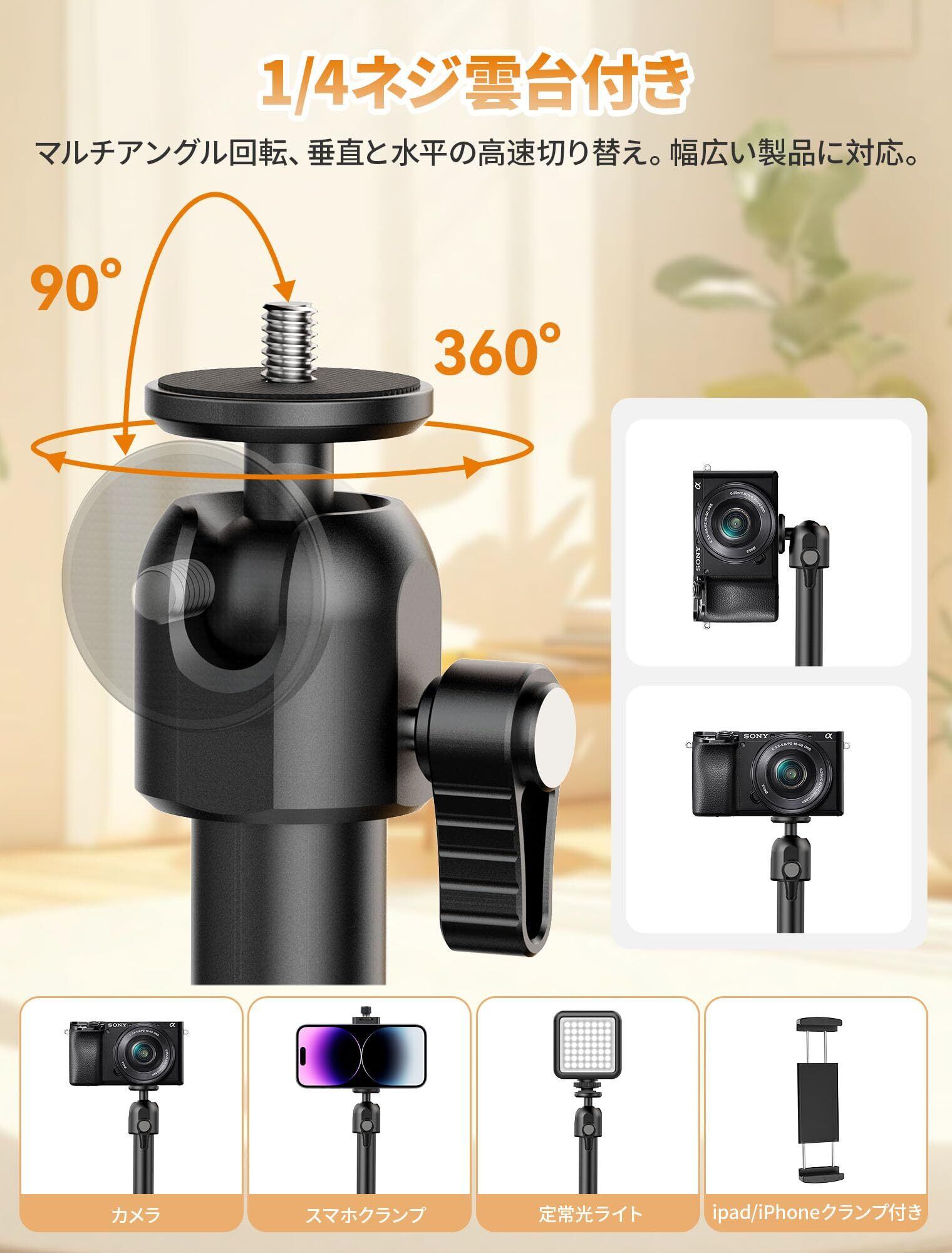 【より操作性が高く、360°柔軟な使用】伸縮式を採用しており、ノブを通してカメラアームが46-109cm範囲高さを調整でき、接写と広角のビデオを撮影でき、スペースを究極に活用します。ポールも上下180°調整可能、動きの自由度が大幅に向上します。ダンピンググリス含め雲台の特殊な構造により、カメラアームが自由度の高い360°回転が可能で、調整がよりスムーズになります。装置の接続部分にはボールヘッドが組み込まれており、ポールの移動中にデバイスは前後180°、左右360°回転できます。