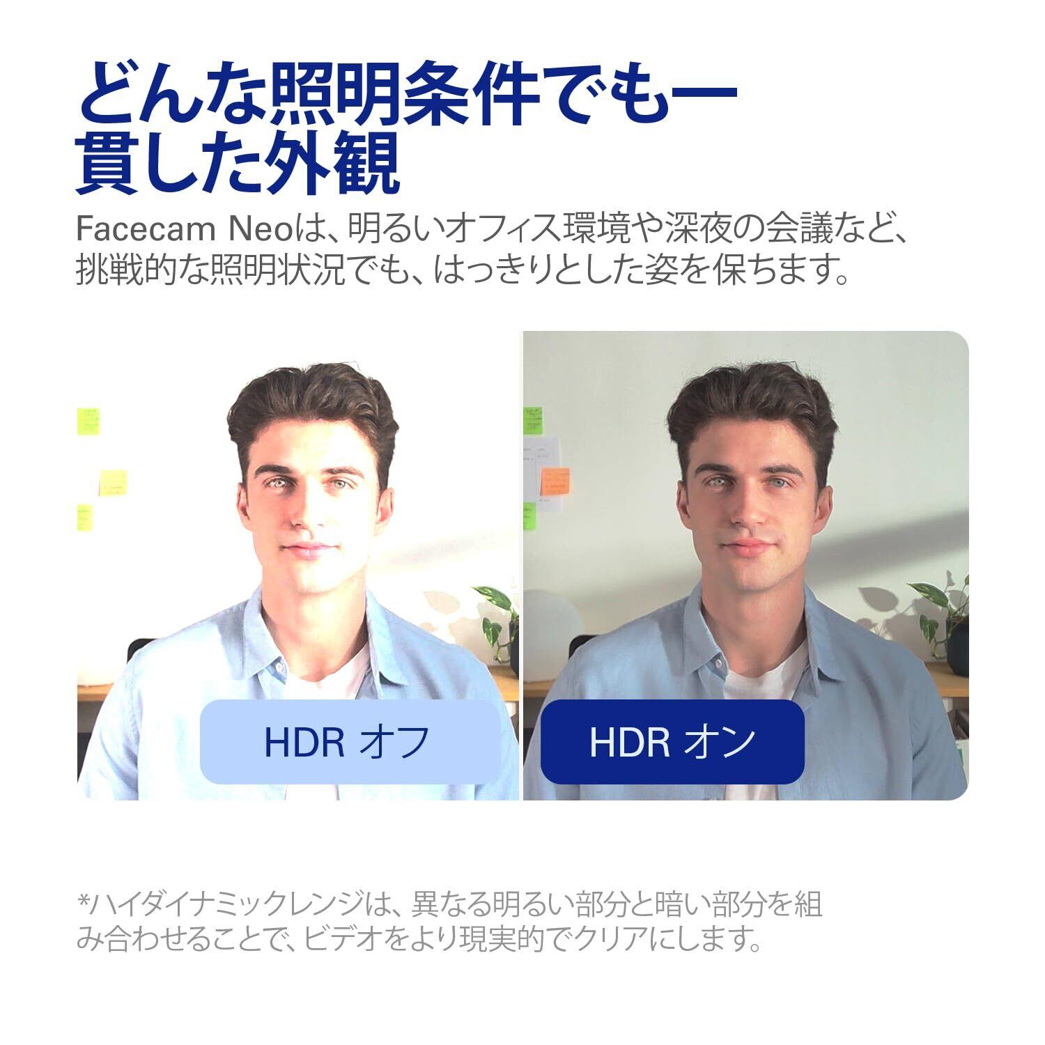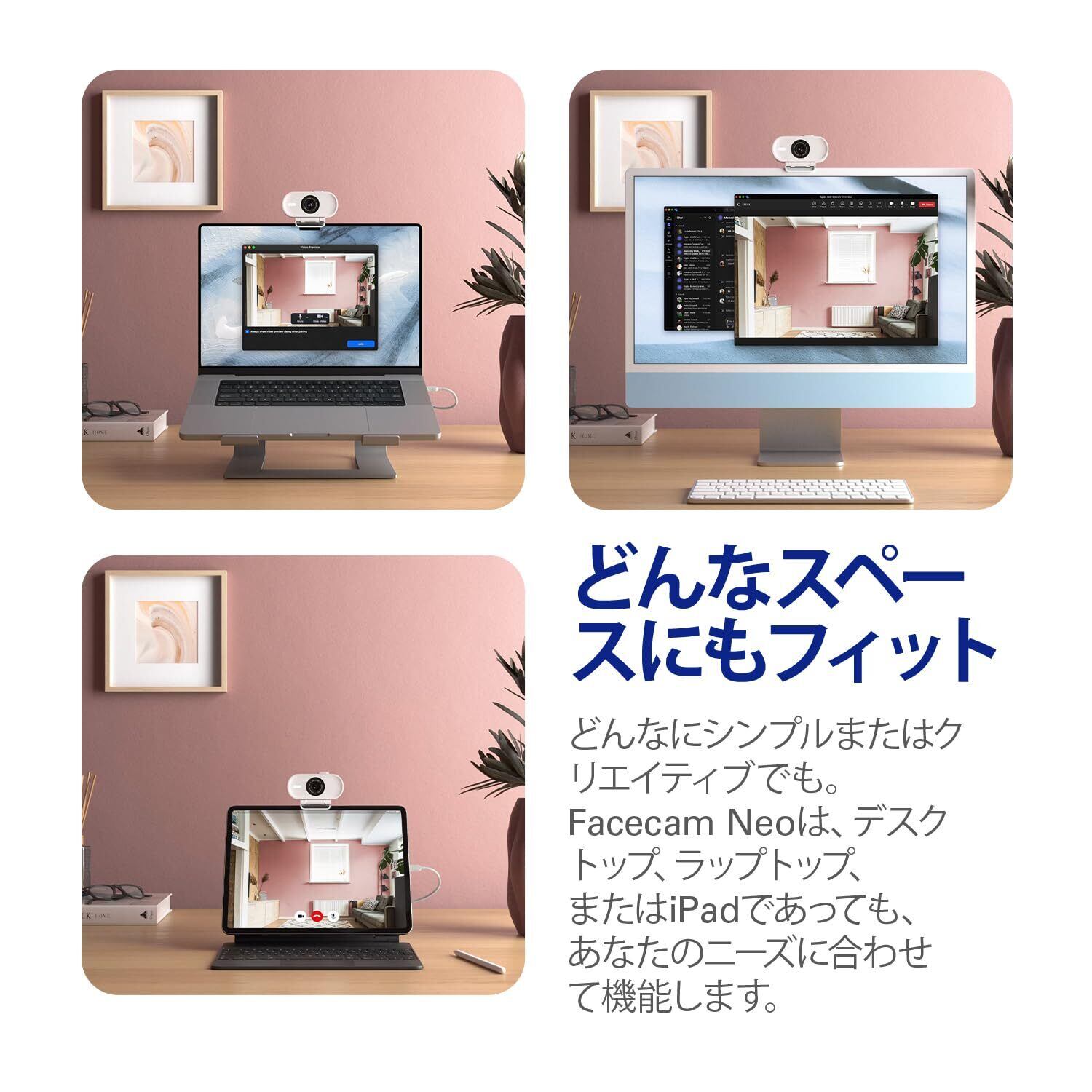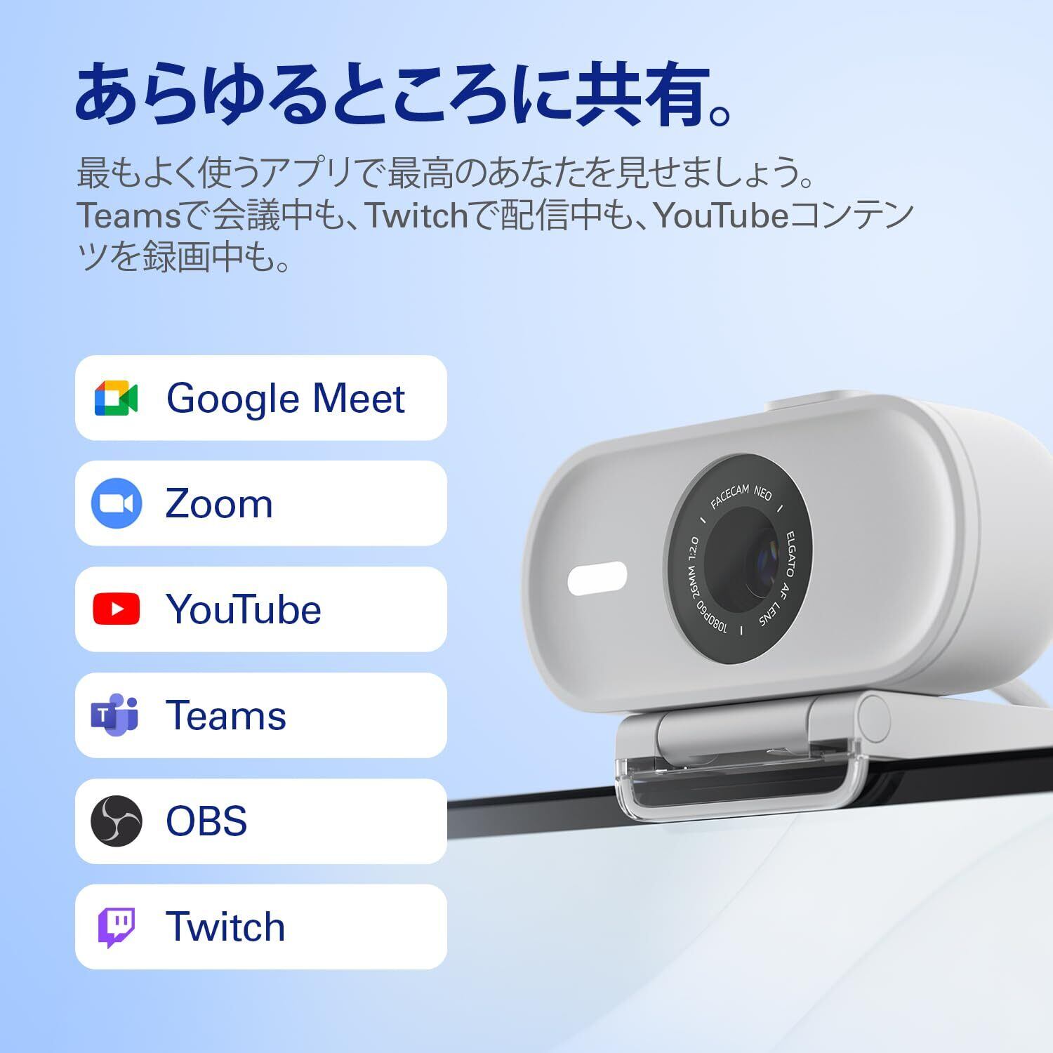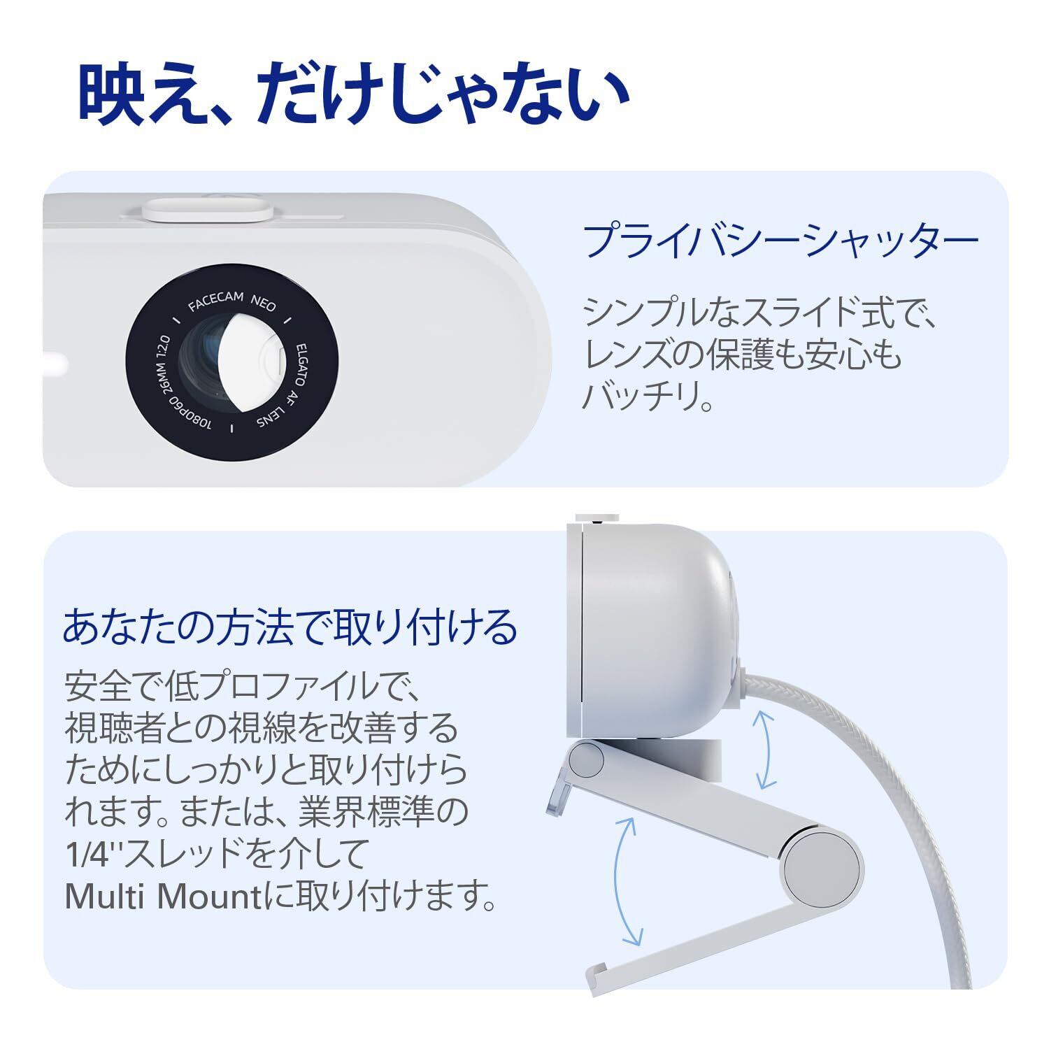 すごいビデオを簡単に。 Facecam Neoをご紹介します。このプラグアンドプレイのウェブカメラは、日々の会議やライブストリーミングを滑らかな1080p60の真のHDでキャプチャします。 箱から出したら、あっという間に簡単に始められます。USB経由でノートバソコンやデスクトップに接続するだけ。 ですから、自信を持ってカメラのスイッチをオンにできます。 技術仕様 対応解像度 (MJPG): 1080p60、1080p30、720p60、720p30、540p60、540p30 光学: Elgato AFレンズ (自動焦点) 焦点範囲: 30 cm / 12 in – ∞ 絞り: f/2.0 焦点距離: 26 mm (フルサイズに同等) 画角: 77° センサー: CMOS センサー 1/2.9\" 接続: USB Type C (固定) 取り付け: 1/4" ねじ山 USBビデオクラス: UVC 標準 v1.5 サイズ (横幅、奥行き、高さ): 88 x 32 x 40 mm | 3.5 x 1.3 x 1.6 in (マウントを含まない) 重量: 80 g | 0.18 lb (マウントを含まない)、110 g | 0.24 lb (マウントを含む) システム要件 Windows 10 (64ビット) またはそれ以降、Intel または AMD CPU macOS 12、またはそれ以降、Intel または Apple CPU iPadOS 17、またはそれ以降 USB 2.0 (またはそれ以降) Type C、USB 2.0 (またはそれ以降) Type A (アダプタ付き、別売り)