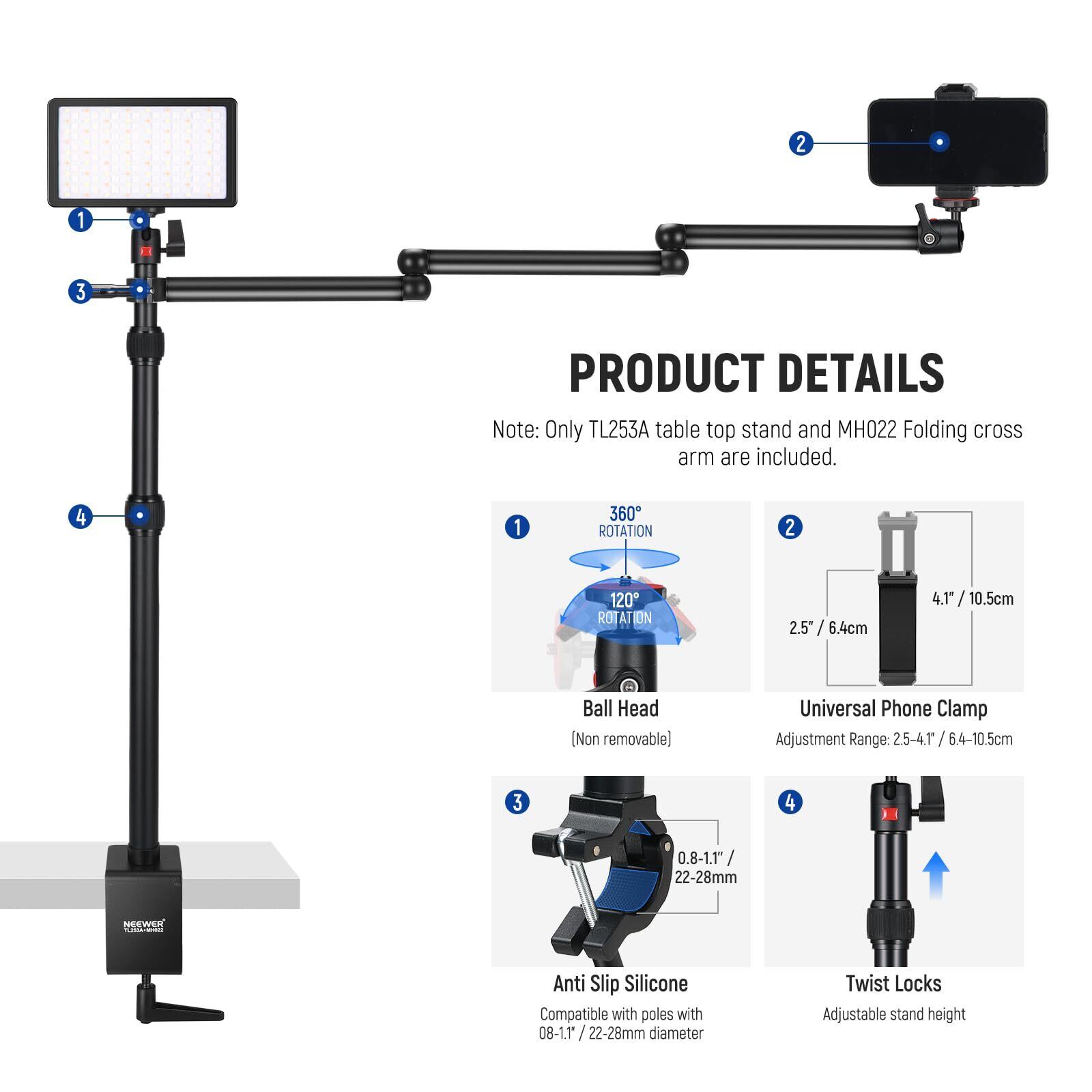 【多彩なカメラアーム卓上スタンド】NEEWER TL253A+MH022 卓上スタンドキットは理想的な生放送ソリューションで、ビデオ録画、生放送、ビデオ会議、ポッドキャスティング、ゲームに最適です。DSLR/ミラーレスカメラ、LEDビデオライト、マイク、ウェブカメラを連携して、ストリーマーデスクを小型個人スタジオに変えることができます。