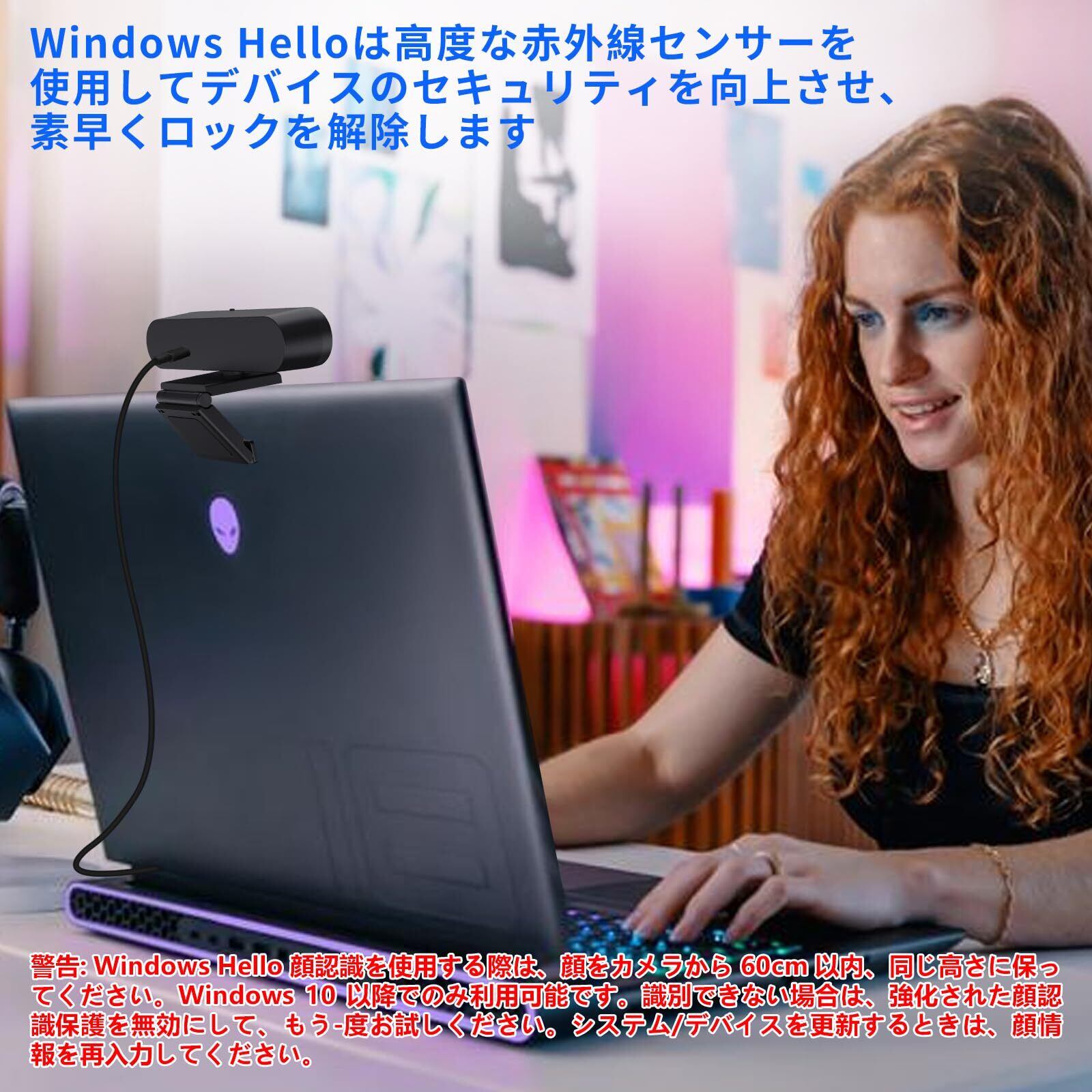 【Window Hello 顔認識】この PC ウェブカメラは Windows 10/11 の Windows Hello をサポートしており、顔認識によってコンピューターを便利かつ迅速にロック解除できます。パスワードは不要です。警告:Windows Hello )顔認識を使用する際は、顔をカメラから60cm 以内、同じ高さに保ってください。Windows 10 以降でのみ利用可能です。識別できない場合は、強化された顔認識保護を無効にして、もう-度お試しください。システム/デバイスを更新するときは、顏情報を再入力してください。