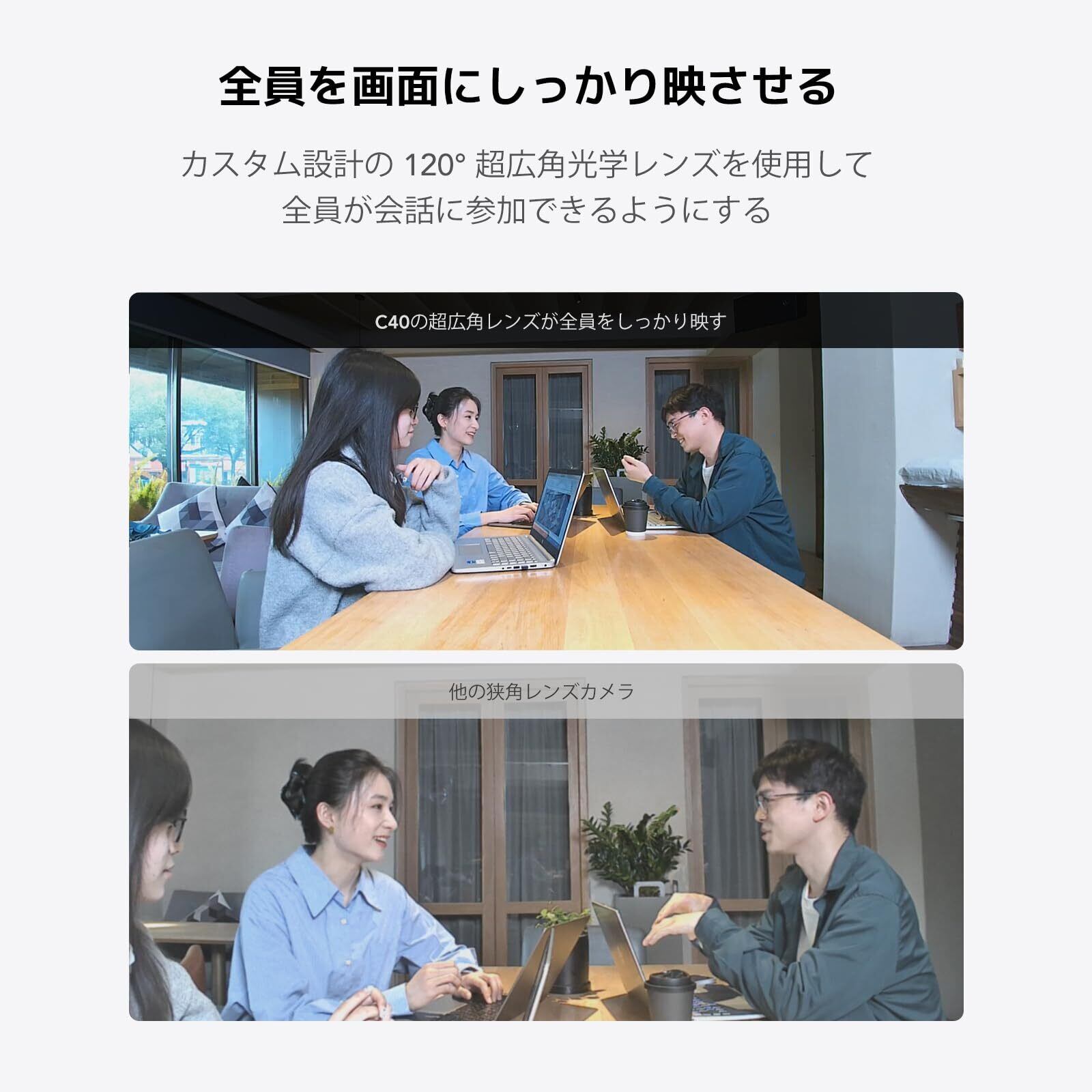 [さらに進化!一台三役のウェブカメラ」Nuroum C40 会議用ウェブカメラは、カメラやマイクとスピーカーが搭載され、1台でweb会議に必要な機能が揃いて使い勝手抜群なデバイスです。超広角120°ウェブカメラ、4つの内臓マイクは最大半径5メートルの音を認識、出力します。自社開発のAI音声最適化技術のスピーカーをすべて1つのスマートで超コンパクトなデバイスに搭載しました。特に大人数シーンに適応なモデルです。パソコンに接続するだけで会議を始められてパソコンとオウルがあればどこでも会議室になります。
