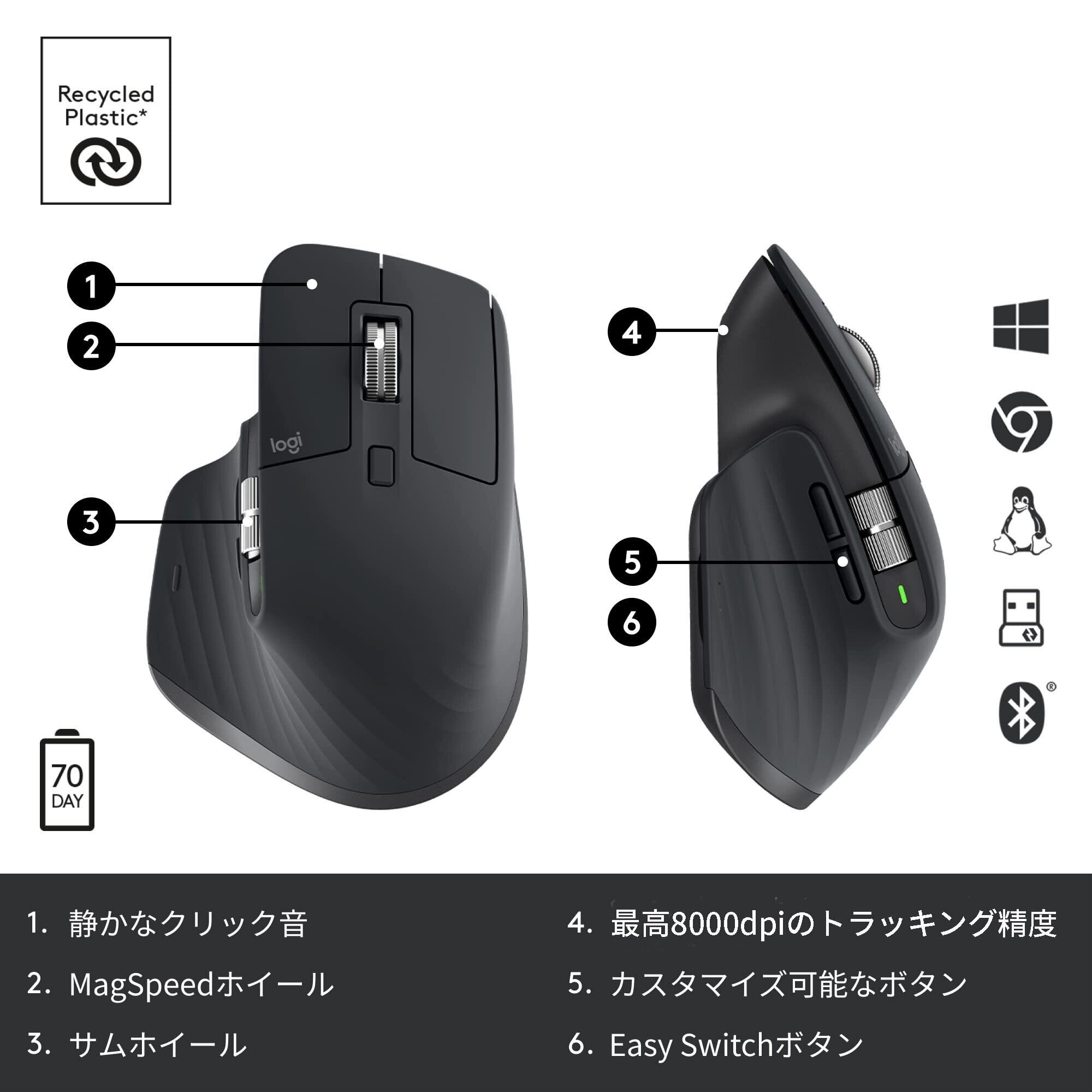 超高速スクロールホイールを搭載、静音モデル&8000dpiにパワーアップした高機能ワイヤレスマウスMX MASTER 3Sに期間間のモデルMX2300GRdが登場! MX2300は従来モデル(MX MASETER 3/MX2200s)の魅力はそのままに、クリック音を約90%カットした静音モデル。 そして、あらゆる表面に対応できるダークフィールドセンサーを採用し、トラッキング精度はこれまでの最高4000dpiから8000dpiにアップ。 更になめらかなマウス操作が可能になりました。 モチロン、従来モデル(MX MASETER 3/MX2200s)の魅力はキープ。 人の手で成形された快適形状のエルゴノミクスデザインのMX MASTER 3は親指用ホイールのついたホイール操作エリアでフィット感と機能性が抜群。 1秒間に1,000行のスクロールが可能な超高速スクロールホイールを搭載し、その機能と生産性を向上しています。 さらにLogicool Options+(無料アプリケーション)(※1)を使えば4つの操作ボタンをお好みにカスタマイズすることが可能。 よく使うワークフローにあわせて各ボタンの操作を設定し、ワンタップでアクションすることができます。 接続はBluetoothとロジクールの新通信技術「Logi Bolt」に対応(※2)。 「Logi Bolt」はグローバルスタンダードに基づいた安全でクローズドな接続を実現し、対応デバイス6台に1つのUSBで接続可能なため、USBポートを有効活用することができます(接続距離:10m)。 また、ロジクール独自のFLOW機能に対応し、テキスト、画像、およびファイルを最高3台のパソコン・OS間をドラッグのみでデータ移動が可能。 WindowsとmacOSオペレーティングシステム間でも流れるような操作が可能です。 またロジクール独自のEasy-Switch機能を搭載。本体裏面のEasy-Switchボタンで最大3台の接続デバイスを簡単に切り替えることができます(※3)。 USB-C-Aタイプの充電式。1分間の充電で3時間の使用が可能な高速充電にも対応。フル充電で最大70日間の電池寿命。メーカー期間間。 対応OS: [Bluetooth] Windows 10、Windows 11以降、macOS 10.15以降、iPadOS 14以降、Chrome OS、Android8.0以降 [Logi Bolt USB] Windows 10、Windows 11以降、macOS 10.15以降、Chrome OS