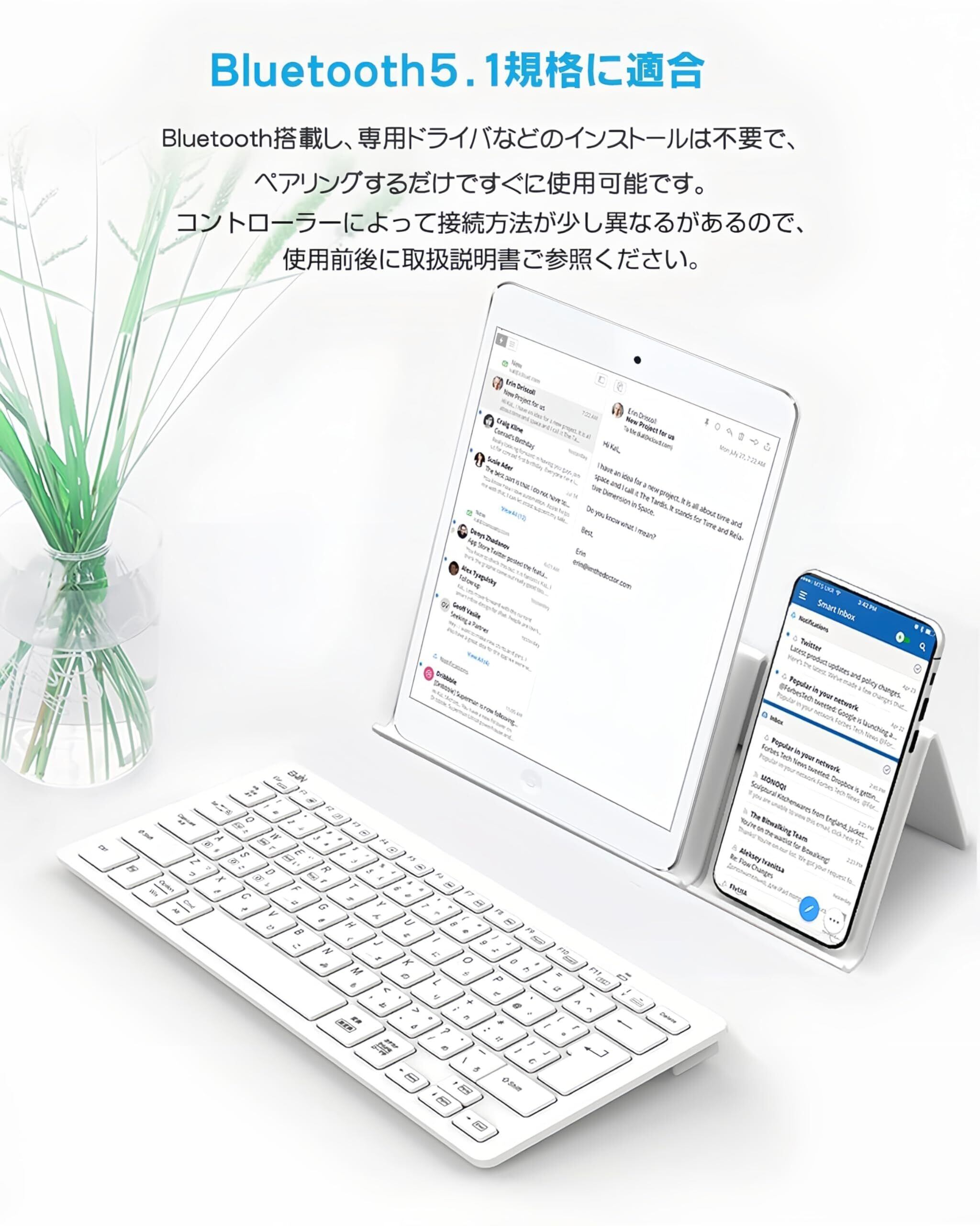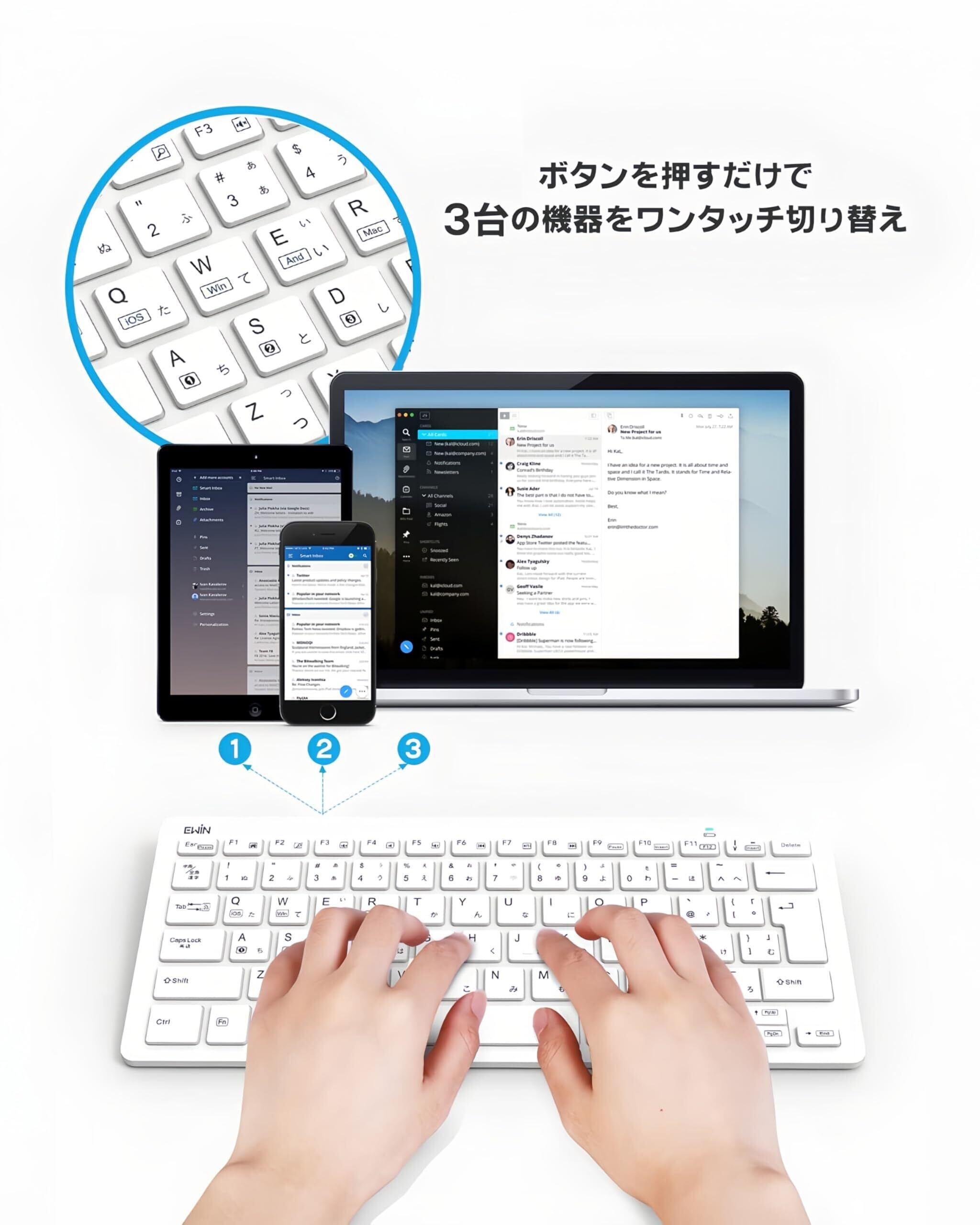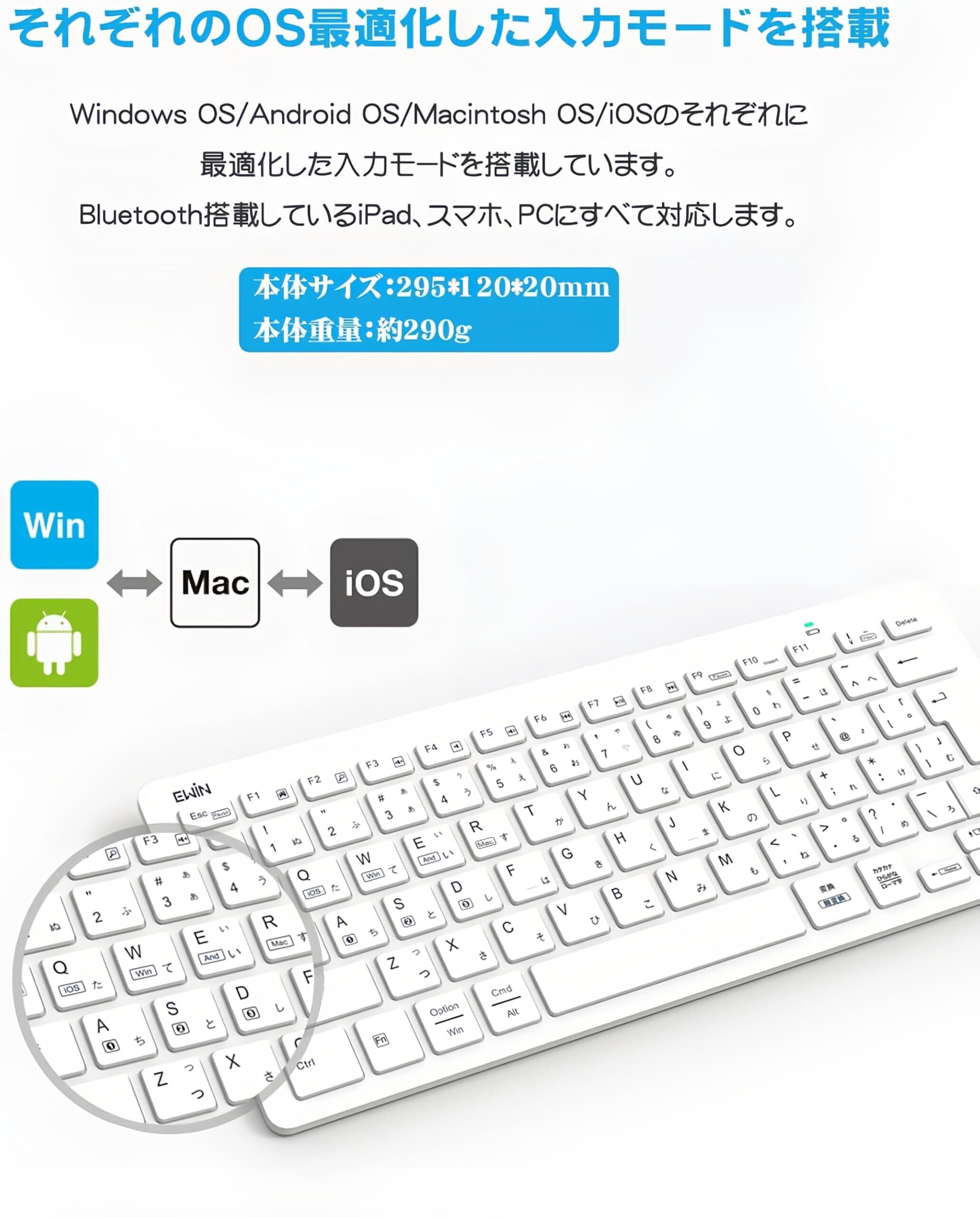 Ewin キーボード ワイヤレス bluetooth JIS基準日本語配列 かな入力 Mac iOS Android Windows など対応 マルチデバイス接続可能 小型 静音 薄型 軽量 コンパクト PC ノートパソコン スマホ タブレット (ホワイト)