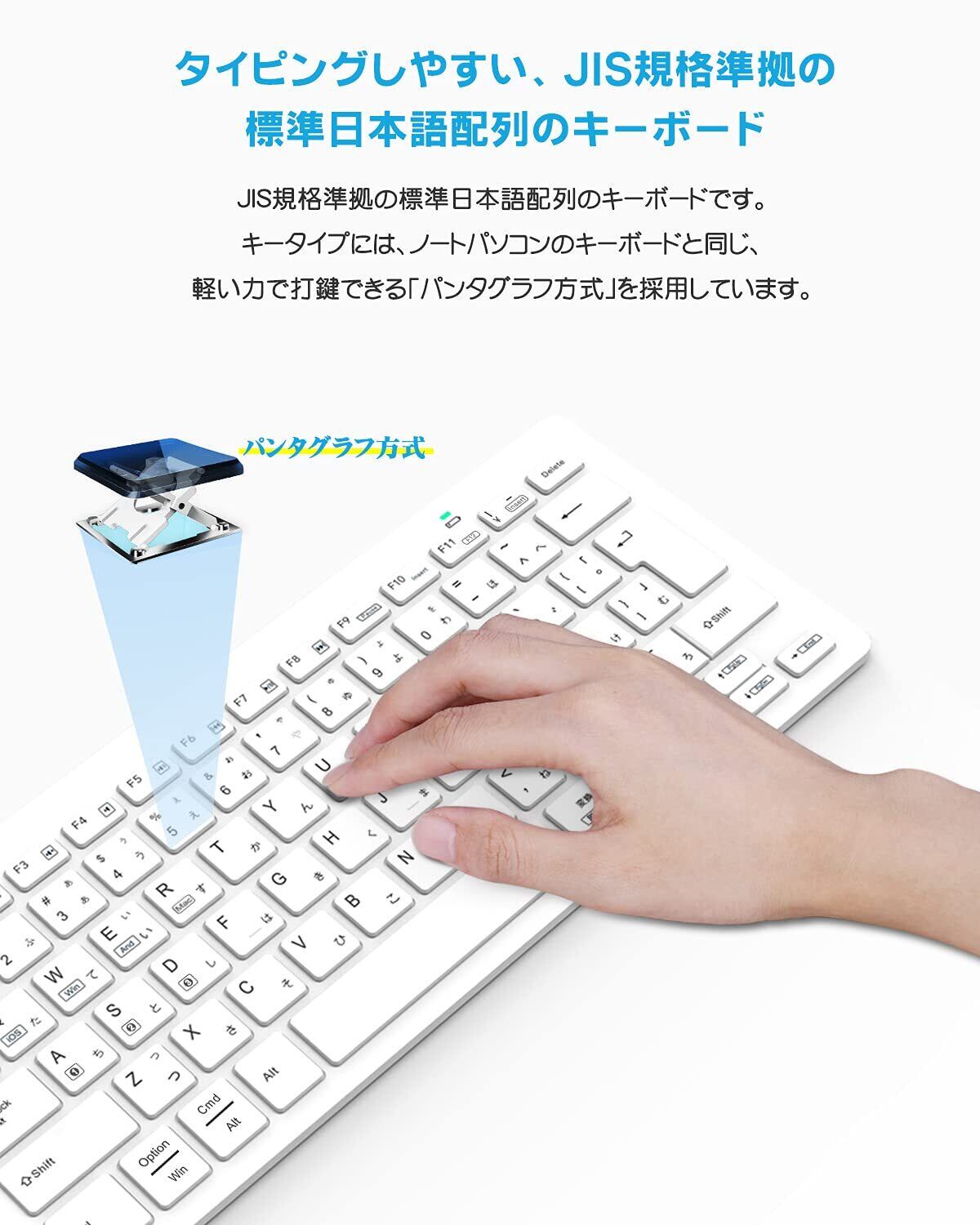 【JIS規格準拠の日本語配列で快適タイピング】 EWINのワイヤレスキーボードは、JIS規格準拠の標準日本語配列を採用。かな入力も英語入力もスムーズで、ノートPCと同じパンタグラフ方式で軽いタッチなのに打鍵感が快適。19mmのキーピッチと80キーレイアウトで、コンパクトながらストレスのないタイピングを実現します。