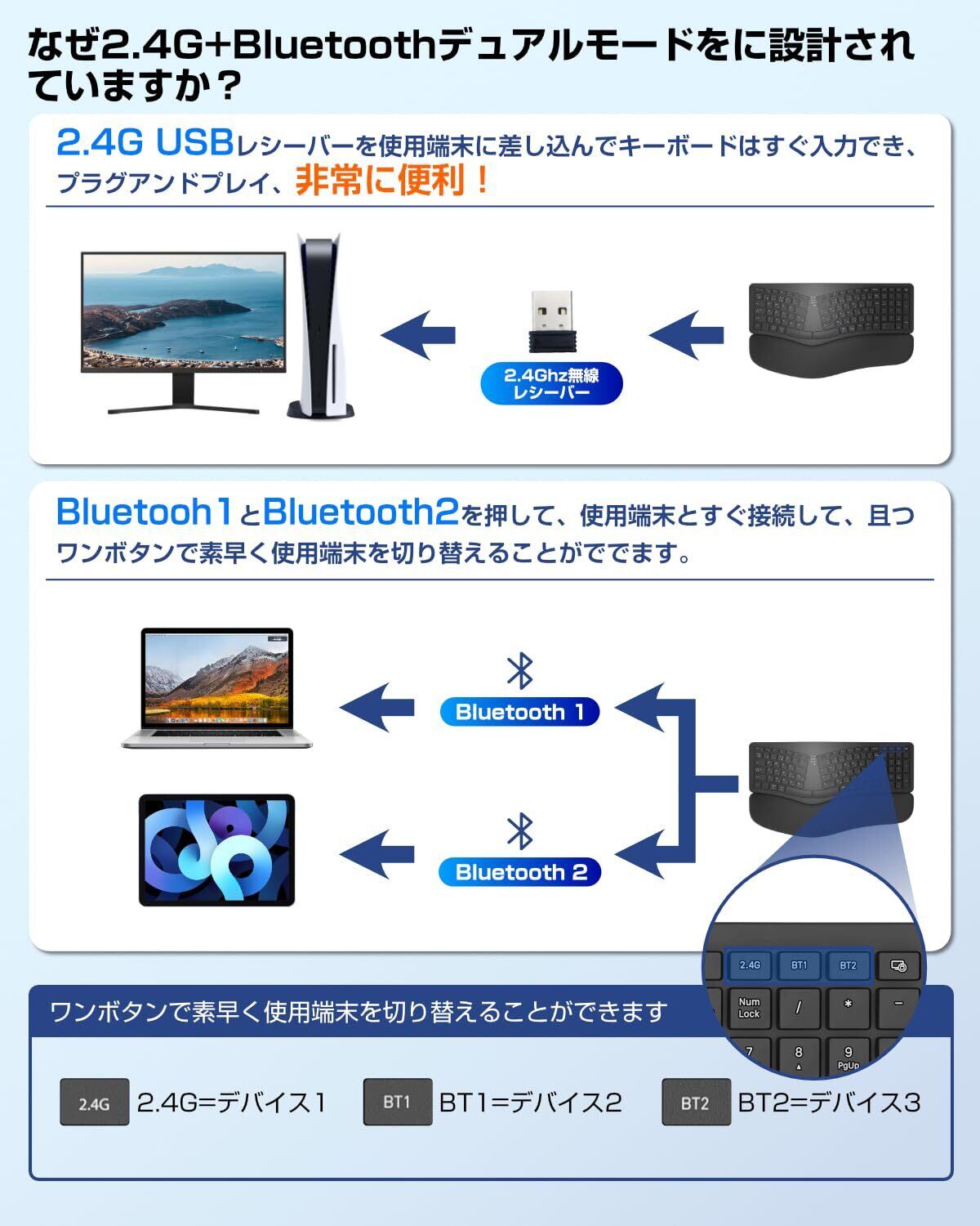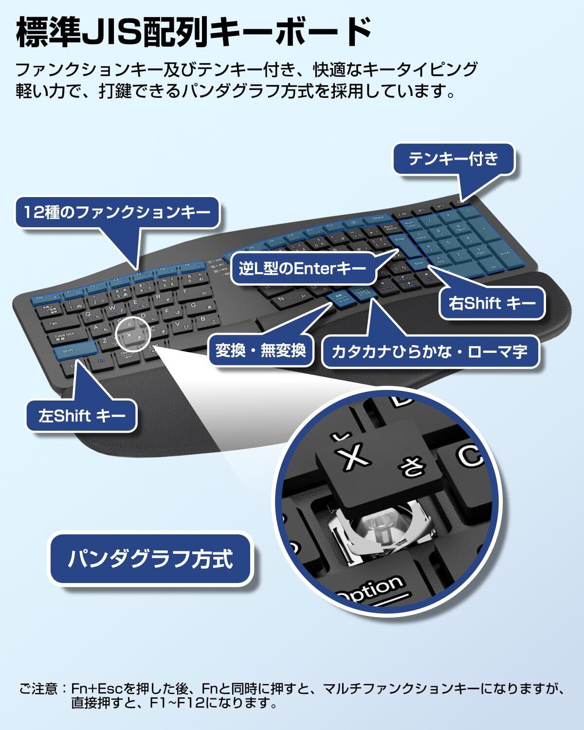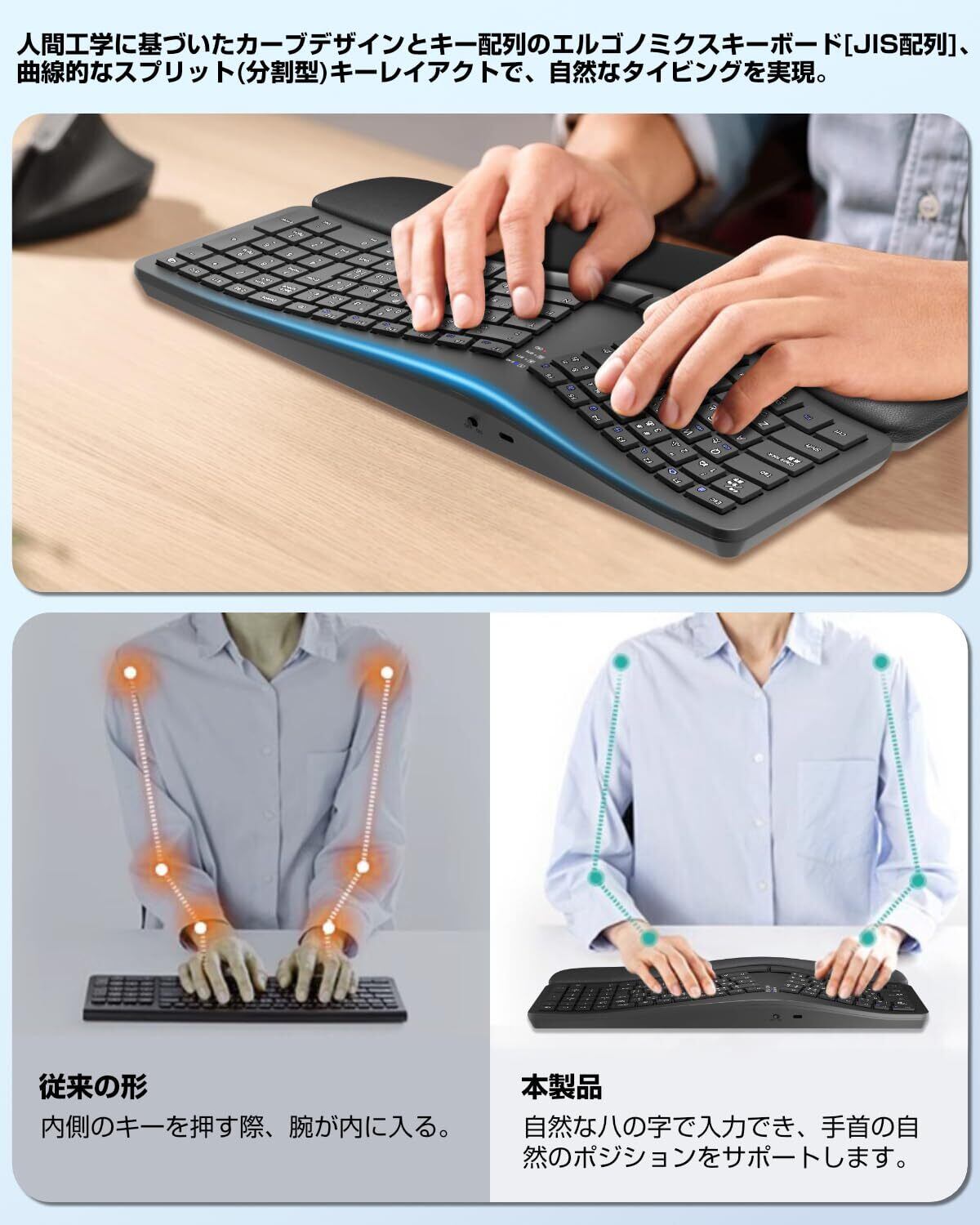 Ewin エルゴノミクス キーボード Bluetooth JIS配列 疲れにくい 2.4G+Bluetooth両対応 ワイヤレスキーボード 無線 テンキー付き フルサイズ 左右分離型 人間工学 Windows Mac iOS Android ブラック