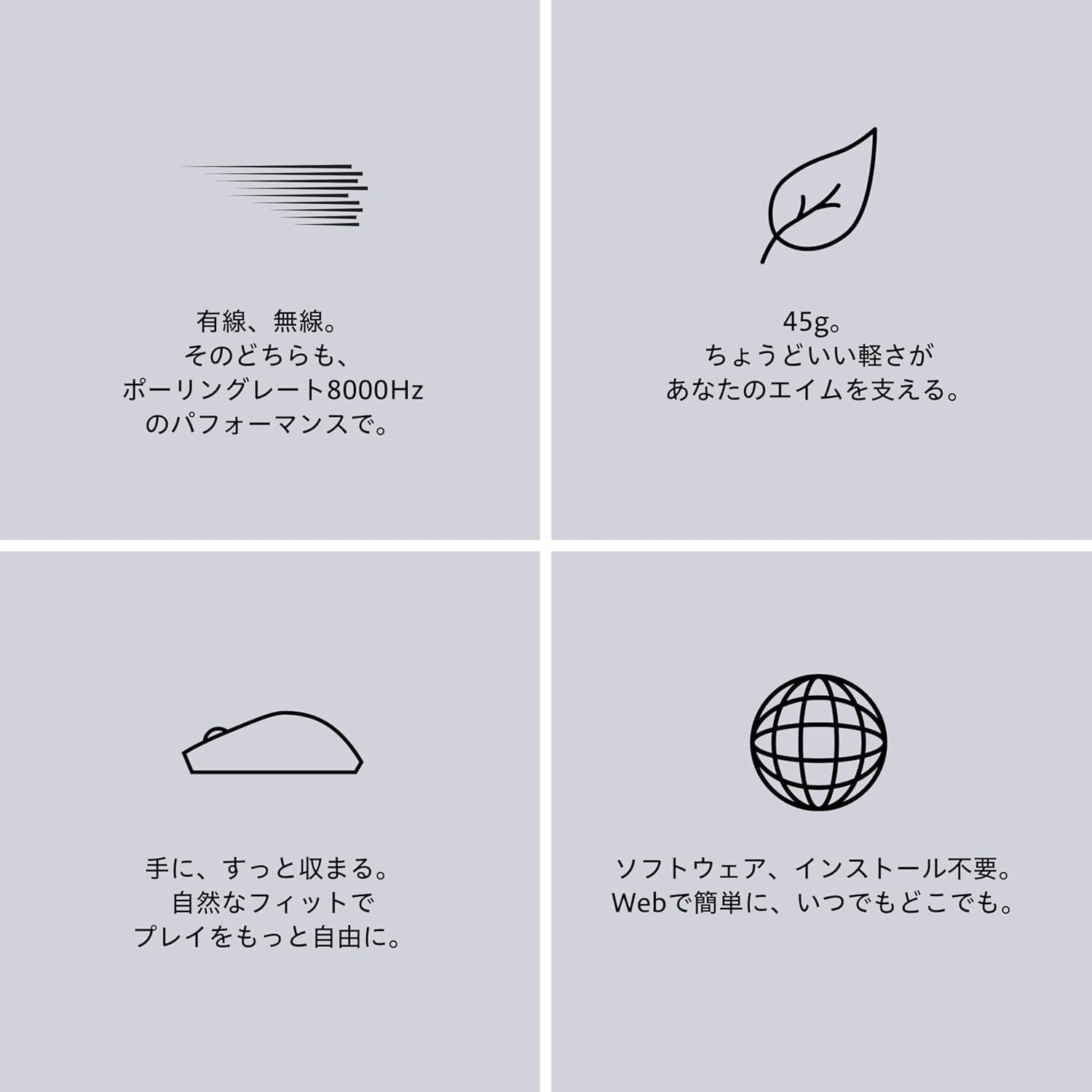 【美しさを研ぎ澄ます、志向のスペック】わずか45gの超軽量ゲームマウス設計と8,000Hzの高速レスポンスが、まるでマウスと手が一体化したような操作感を生み出す。センサーにはPAW3395を採用し、1秒間に8,000回のデータ更新で、わずかなブレも正確に反映する高性能無線ゲーミングマウスです。