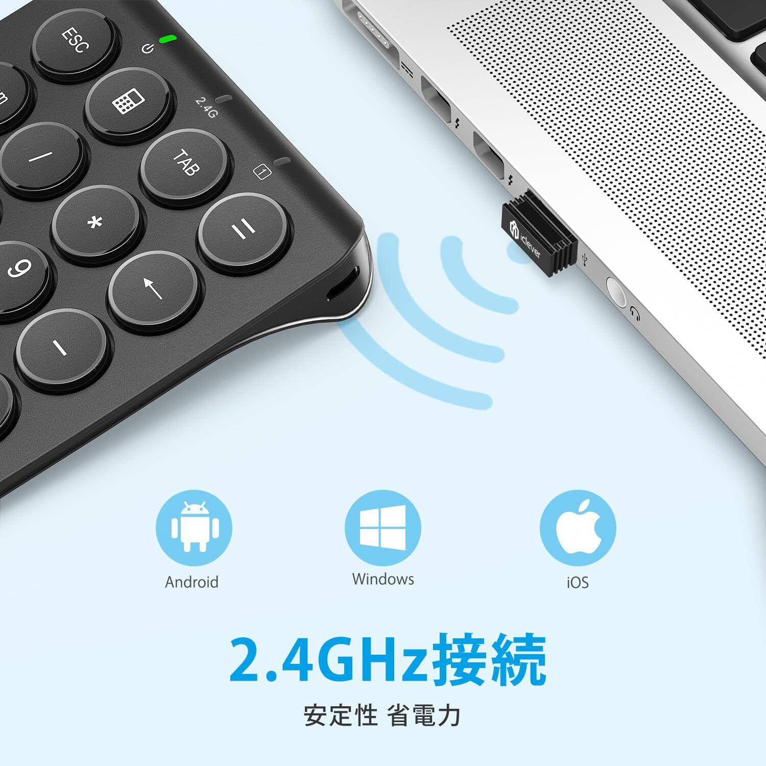 【2.4GHzワイヤレス接続】最大10mの転送距離でも、安定した通信で快適に操作できる2.4GHzのワイヤレステンキーです。専用ドライバなどのインストール作業は不要で、レシーバーをUSBポートに差し込むだけで使用できます。本製品はtabなどのキーを搭載しているため、Excelやスプレッドシートなどを使用する際、格段に作業効率が上がります。▲Bluetooth接続ではありませんのでご注意ください。