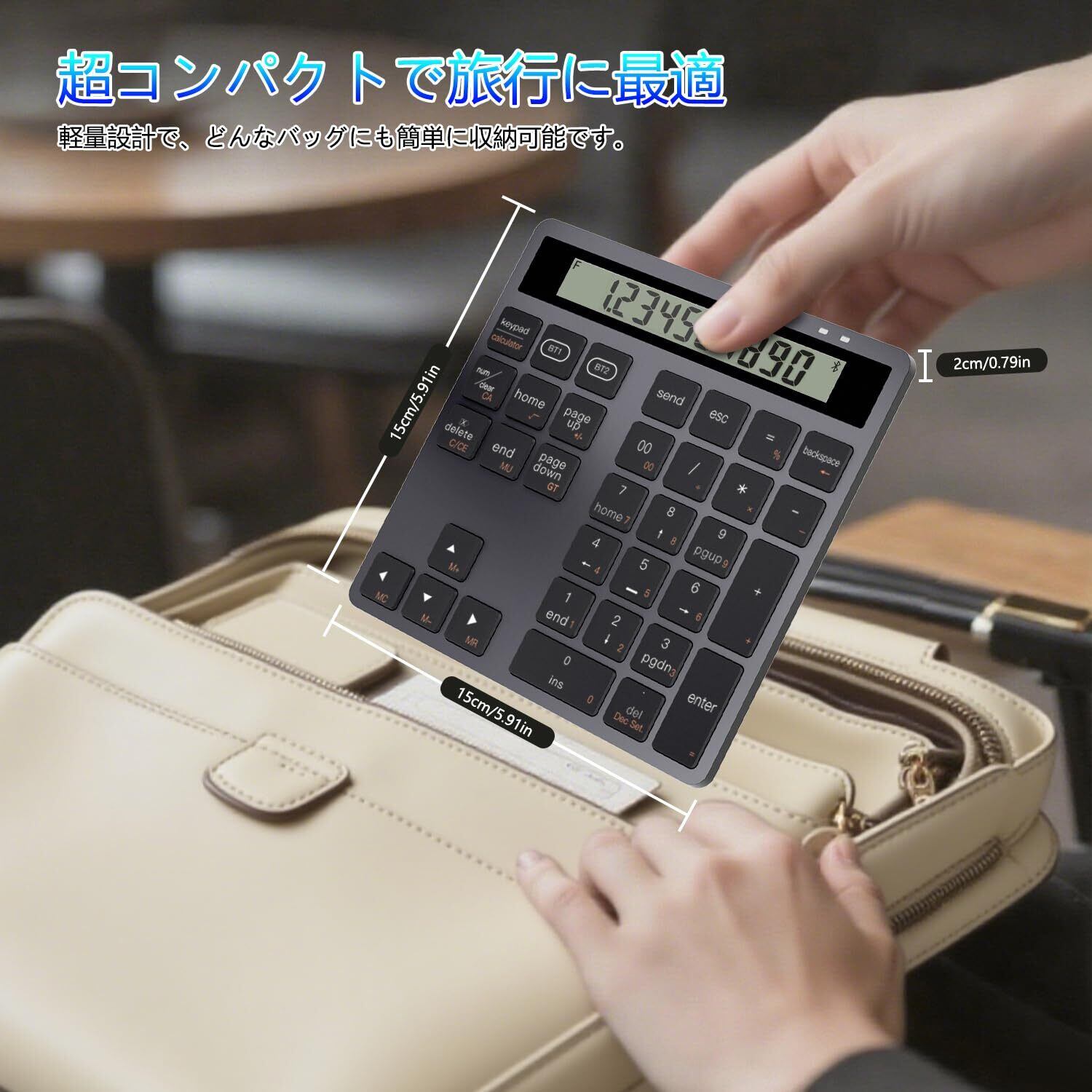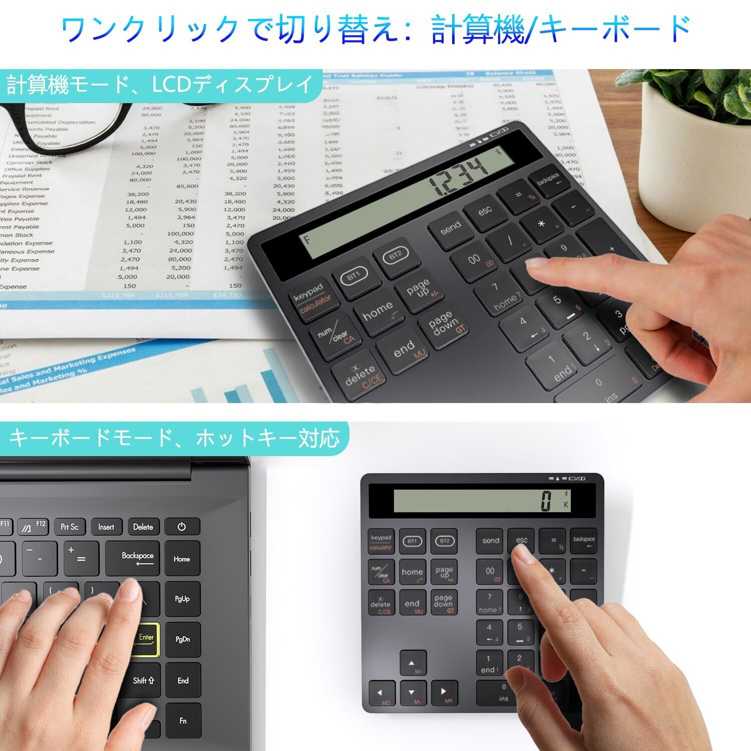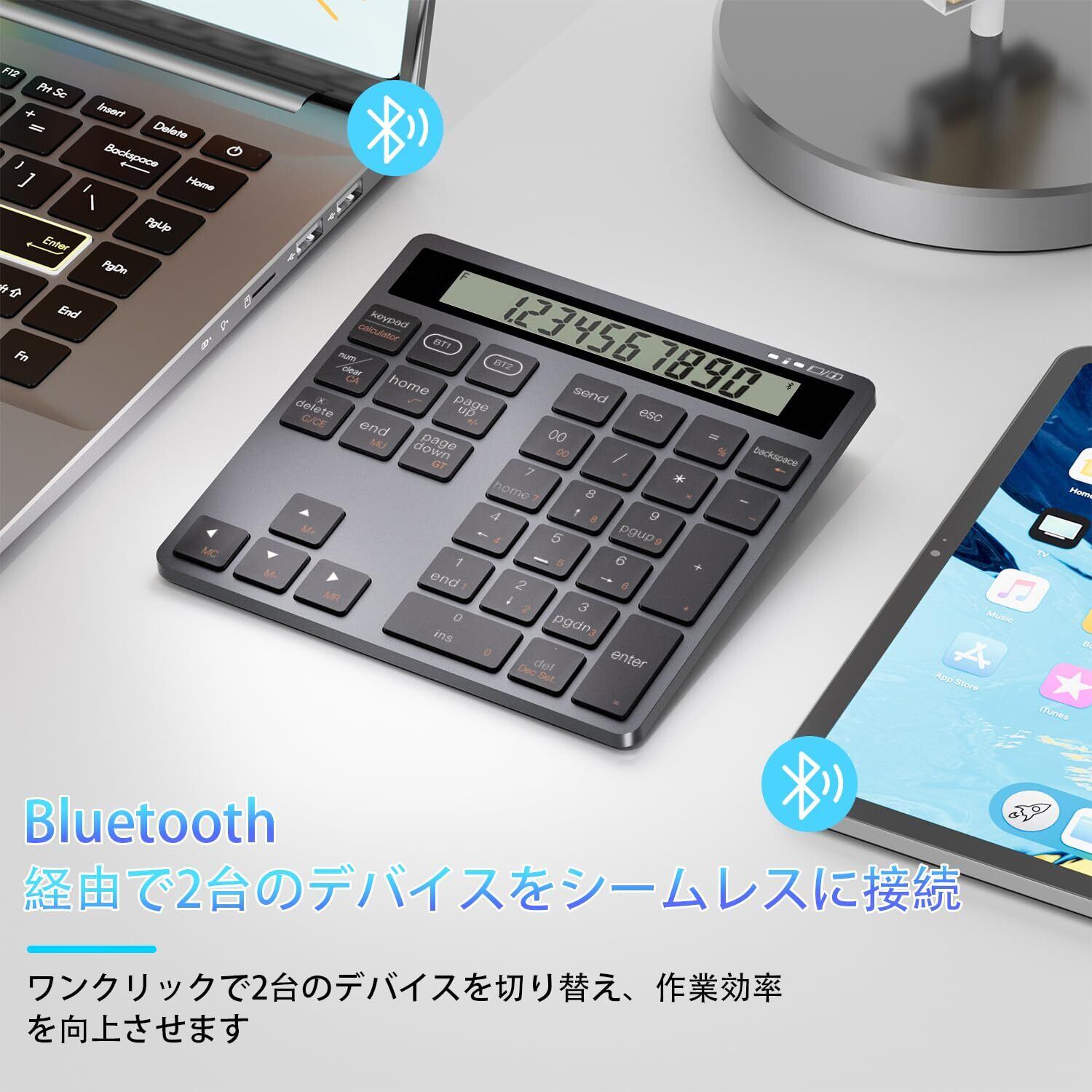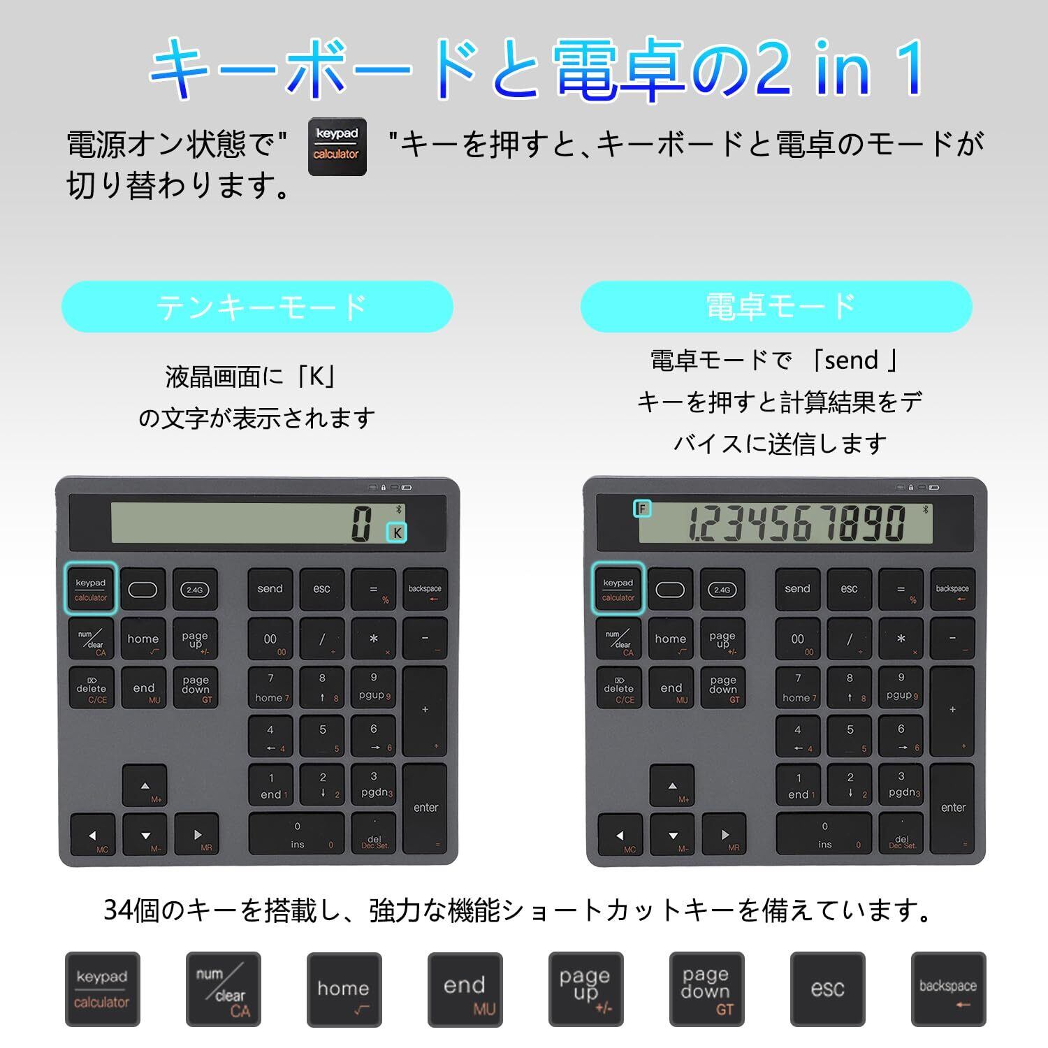テンキー 電卓 2in1 Bluetooth ワイヤレス 2台同時接続 Type-C充電 34キー Macテンキー パンタグラフ式 超薄 軽量 高耐久 ブルートゥース 無線 テン キー ノートパソコン、デスクトップPC、スマートフォン対応
