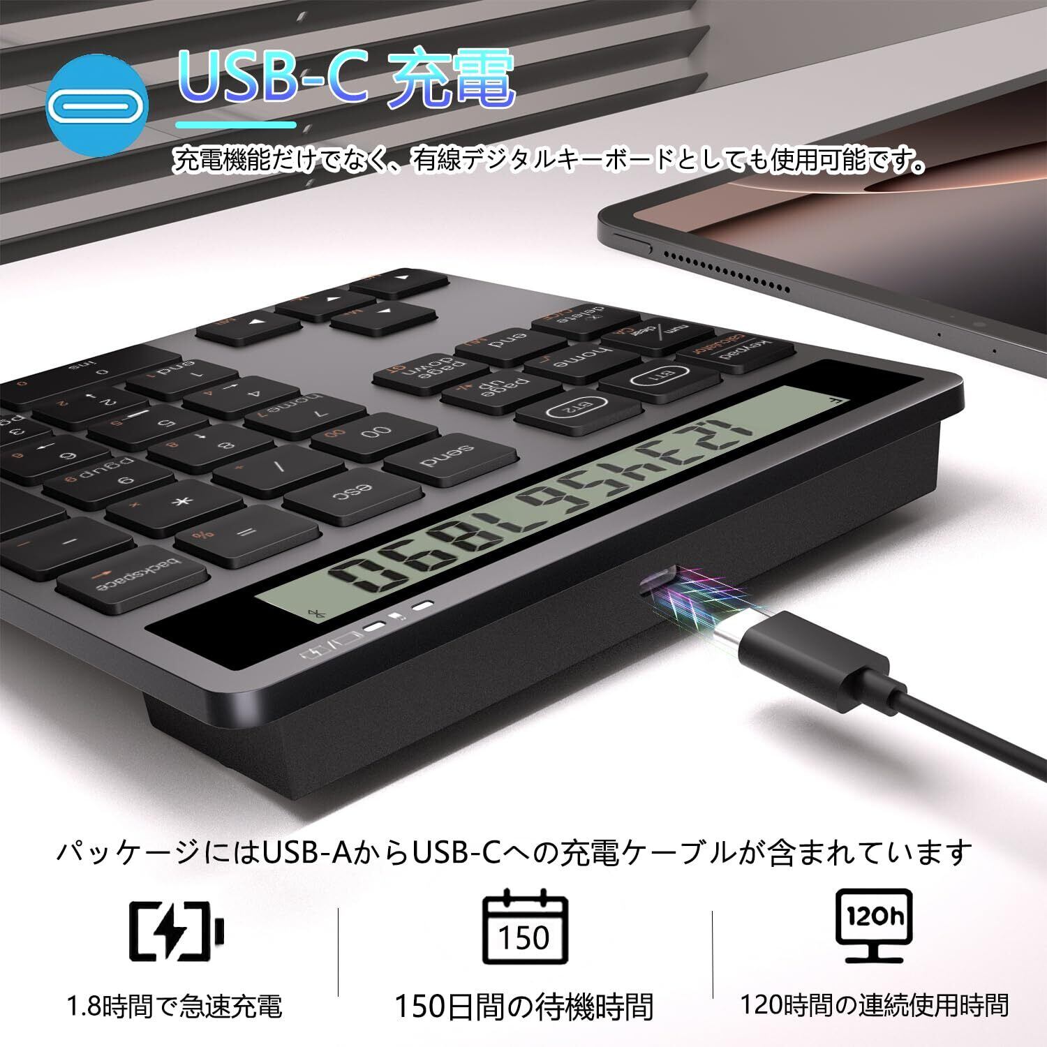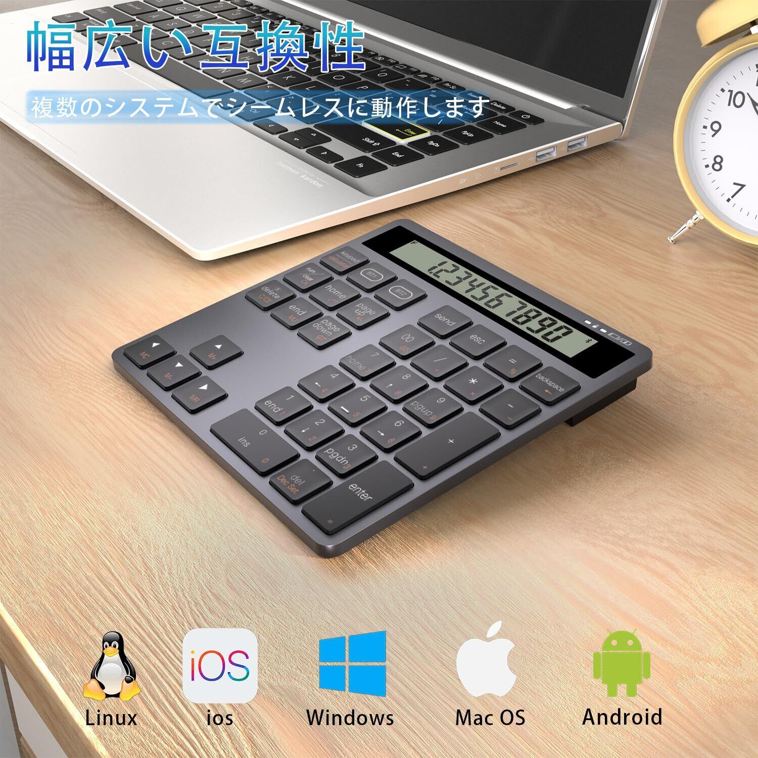 特徴 34キー, Bluetoothワイヤレスと+Type-C有線デュアルモード接続, Type-C充電式, サイレント, 電卓 テンキー bluetooth