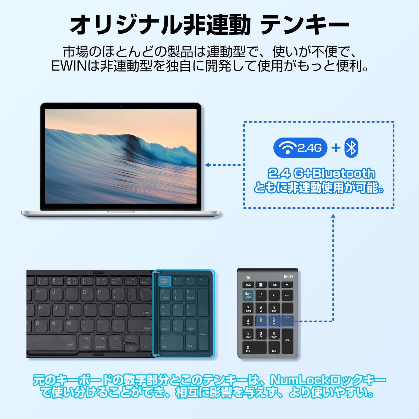 【EWINオリジナルの非連動テンキー】市場のほとんどのテンキーは連動型で不便ですが、EWINは非連動型のテンキーを独自に開発しました。テンキーのNumLockをONにすると、テンキー以外の本体キーボードのテンキー部分にも影響を及ぼしてしまう場合があるため、NumLock非連動機能付きテンキーを選ぶと、本体キーボードの数字部分と本テンキーのNumLockは独立してON/OFFできます。