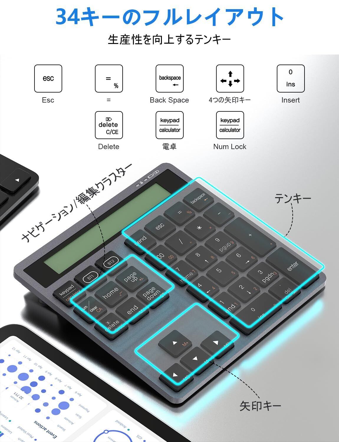 特徴 15°傾斜設計, 34キー, Bluetoothワイヤレスと+Type-C有線デュアルモード接続, Type-C充電式, テンキーと電卓の2 in 1設計