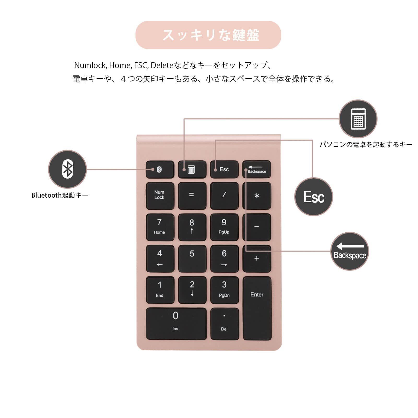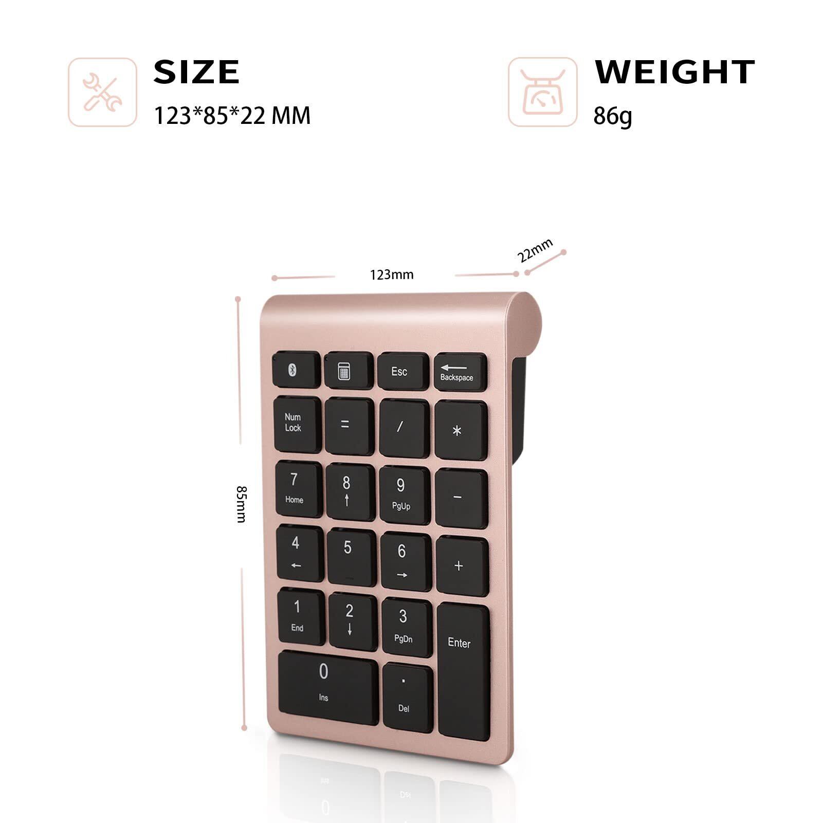 多機能22キーテンキー:Bluetoothテンキーは、NumLock、ESC、Tab、Deleteなどのショートカットをサポートしています。テンキーボードは直接コンピュータの電卓を開くことができます。ワイヤレステンキーは、オフィスワーカーなどがExcelのデータやワークブックを素早く入力するのに最適なキーパッドです。