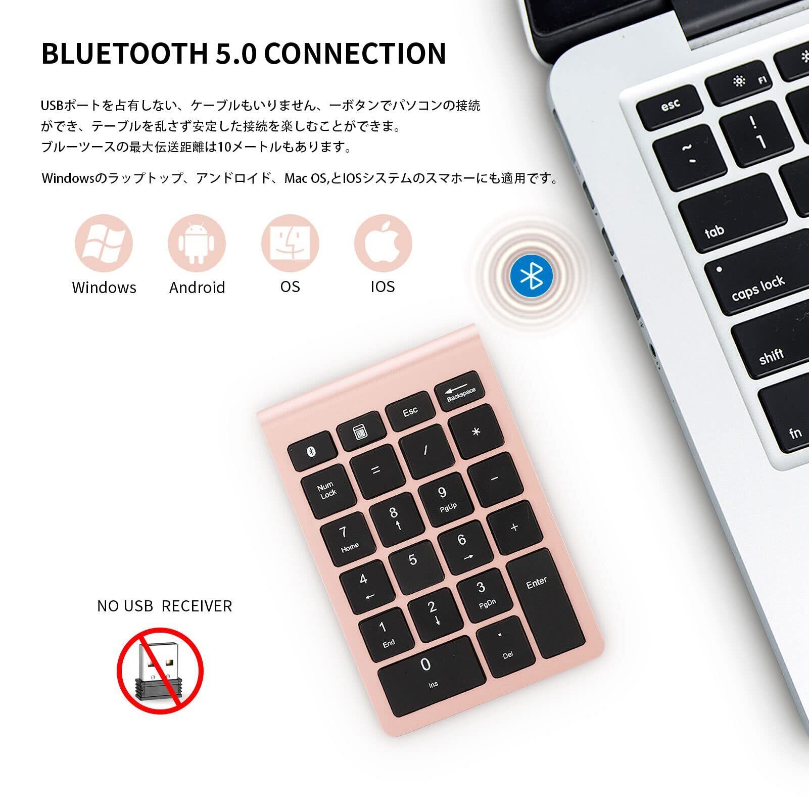 BLUETOOTH 5.0接続:Bluetoothワイヤレスナンバーパッドは、高度なBluetooth 5.0技術を使用して、テンキーをコンピュータとペアリングすることが非常に簡単になり、キーボードの動作距離も10mに拡張してます。