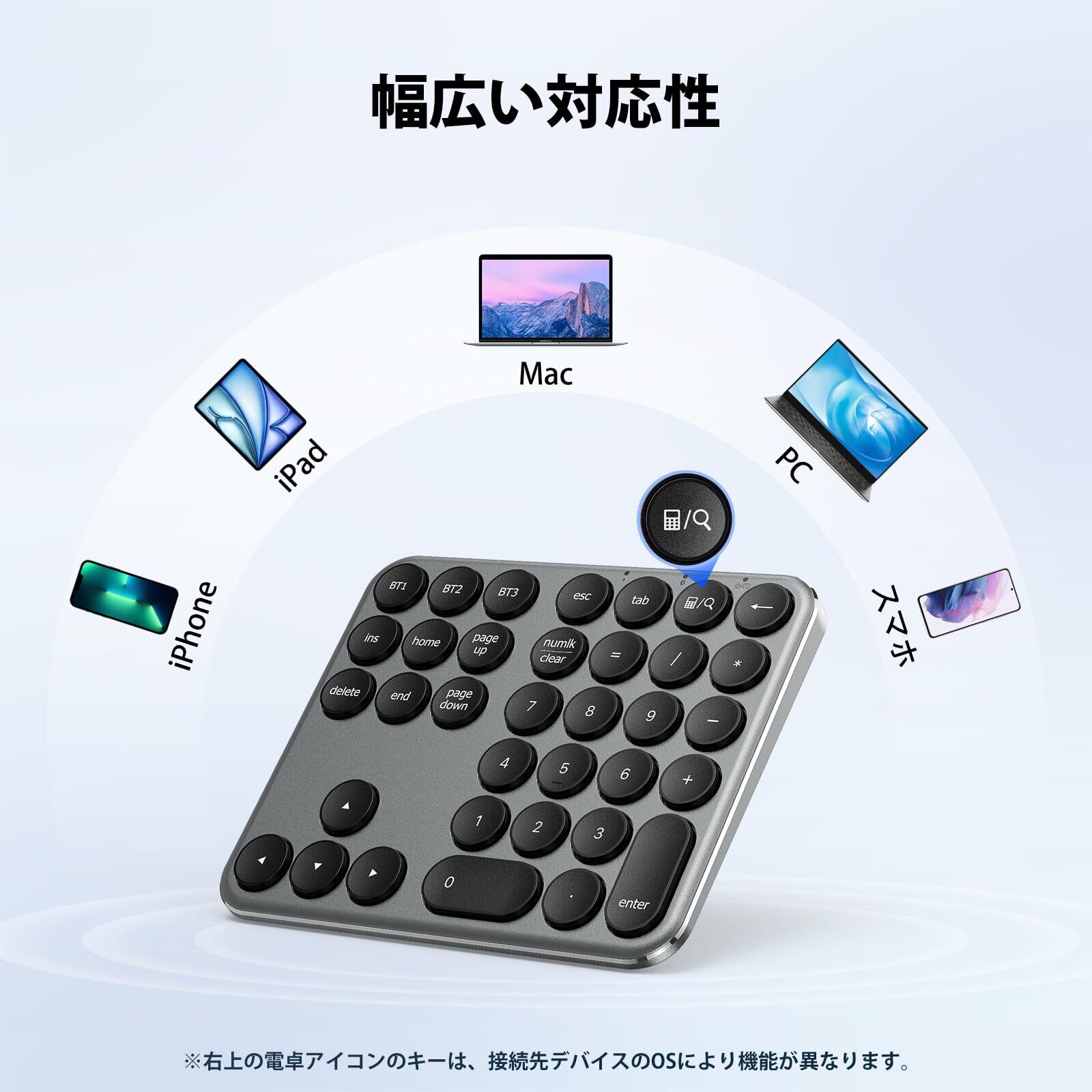 【幅広い互換性】iOS、MacOS、Android、Chrome OS、Windows 8、10、11 と互換性があります。 ※当製品は接続先デバイスのNumlockに連動する連動型となります。テンキーレスキーボードとの併用の際は予めご注意ください。▲接続先デバイスがWindows/Androidの場合は、テンキーは接続先デバイスのNumlockに連動する【連動型】となります。 Mac/iOSデバイスと接続する場合のみ、テンキーは【非連動型】となります。