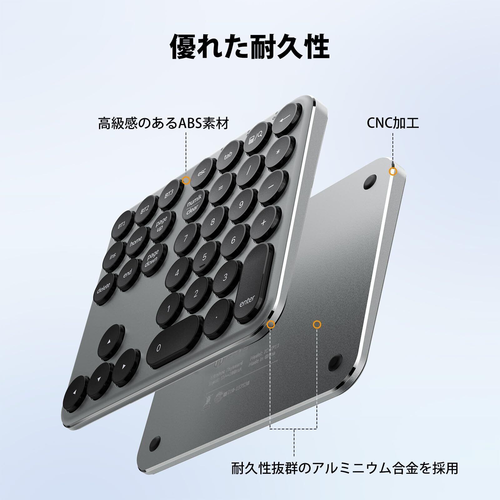 【優れた耐久性・超薄型設計】アルミニウム合金のボトムシェルとABS素材のトップカバー、パンタグラフ式キーの組み合わせにより、キーボードは 148×125×11mm のポータブルサイズを実現しました。金属製のボトムシェルは耐久性を向上させ、変形しにくくなっており、また薄型・軽量設計のため、持ち運びにも便利でカフェなどの外出先での作業にも最適です。