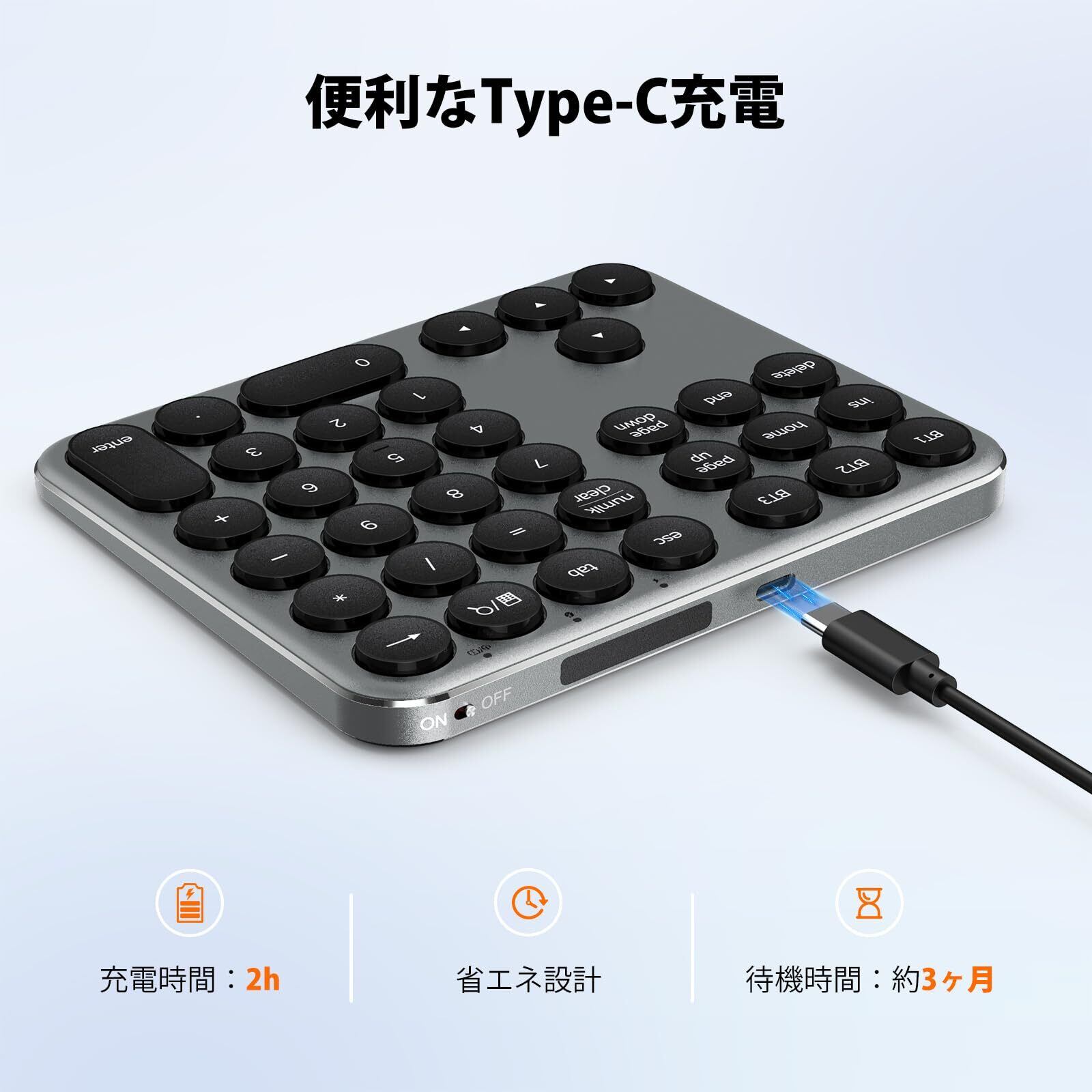 【3台同時接続・ワンタッチ切替】PC・タブレット・スマホなど、最大3台のデバイスを同時ペアリングでき、ワンタップで瞬時に切替可能。Mac・Windows・iOS・Androidに自動再接続し、作業を中断せずスムーズに続行できます。 ※本製品はBluetooth接続式テンキーです。接続先デバイスにBluetooth3.0以降が搭載されていることを、予めご確認ください。有線接続やレシーバー接続はできません。
