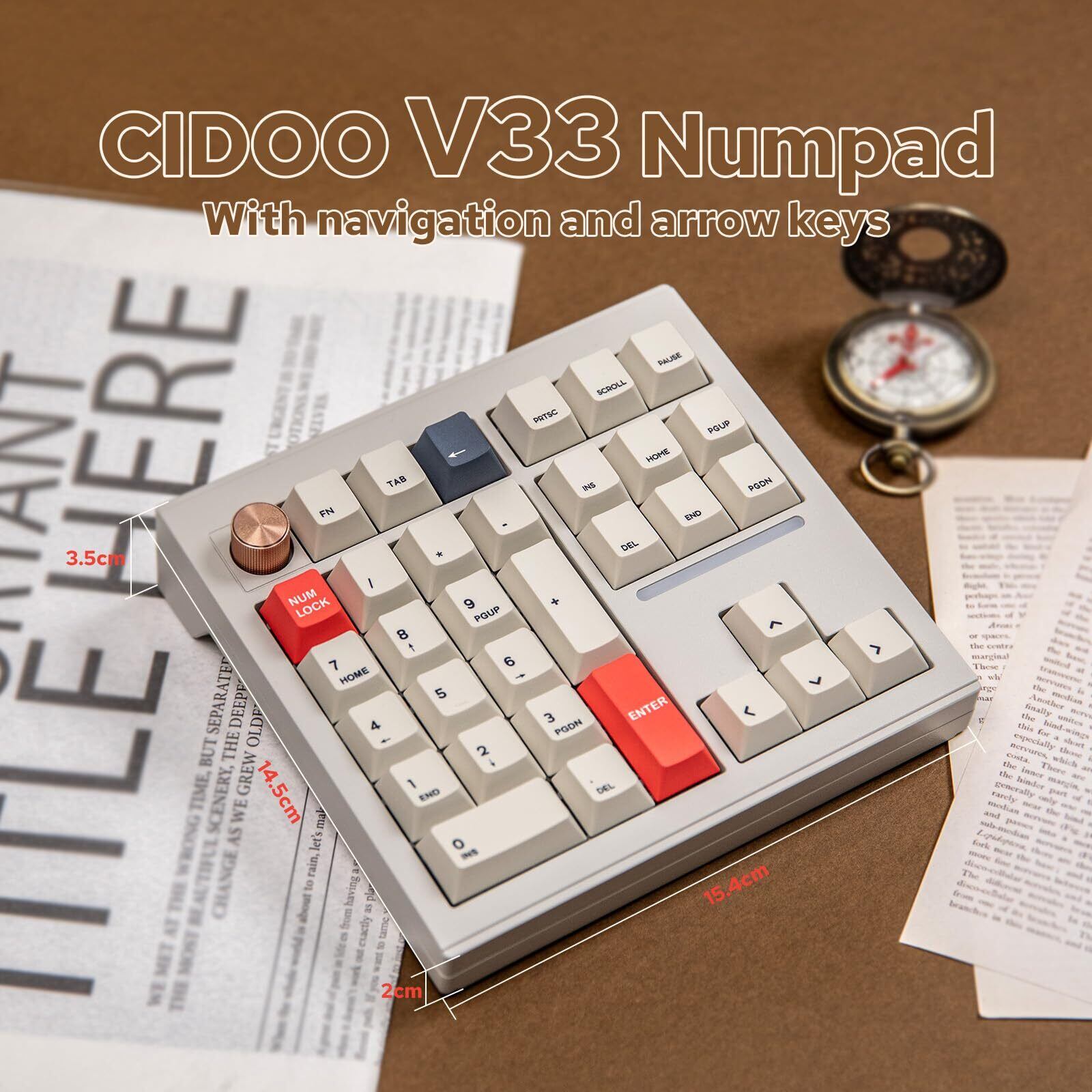 【単なるテンキーを超えたユニークなレイアウト】 CIDOO V33は、テンキー、ナビゲーションキー、矢印キーを組み合わせたユニークでコンパクトなレイアウトが特徴で、数字キーを頻繁に使用するゲーマー、プログラマー、オフィスプロフェッショナルにとって不可欠なツールとなっています。多機能ノブは、利便性とカスタマイズの可能性をさらに高めます。このレイアウトは、メインキーボードとテンキー間の手の移動を最小限に抑え、作業の精度と効率を高めます。