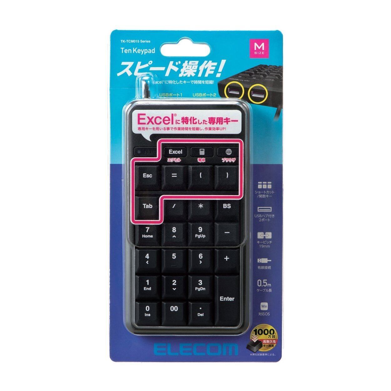 エレコム テンキー 有線 メンブレン Mサイズ USBポート ホットキー付 高耐久 ブラック TK-TCM015BK