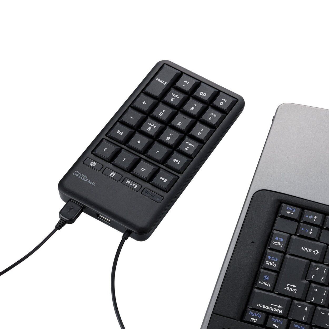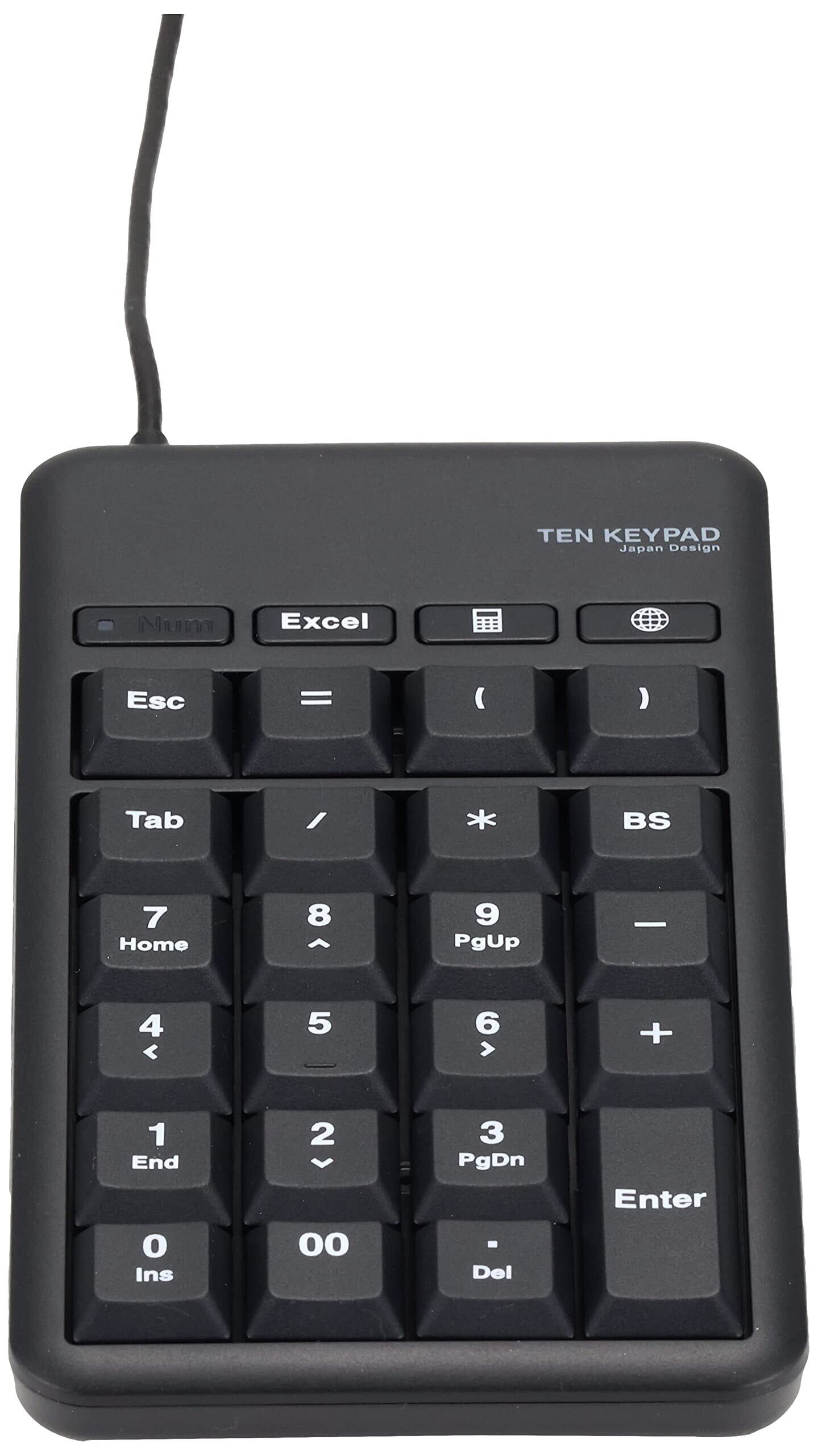 Excel、電卓ソフト、インターネットブラウザをボタン一つで起動できる3種のホットキーが付いたUSBテンキーパッドです。