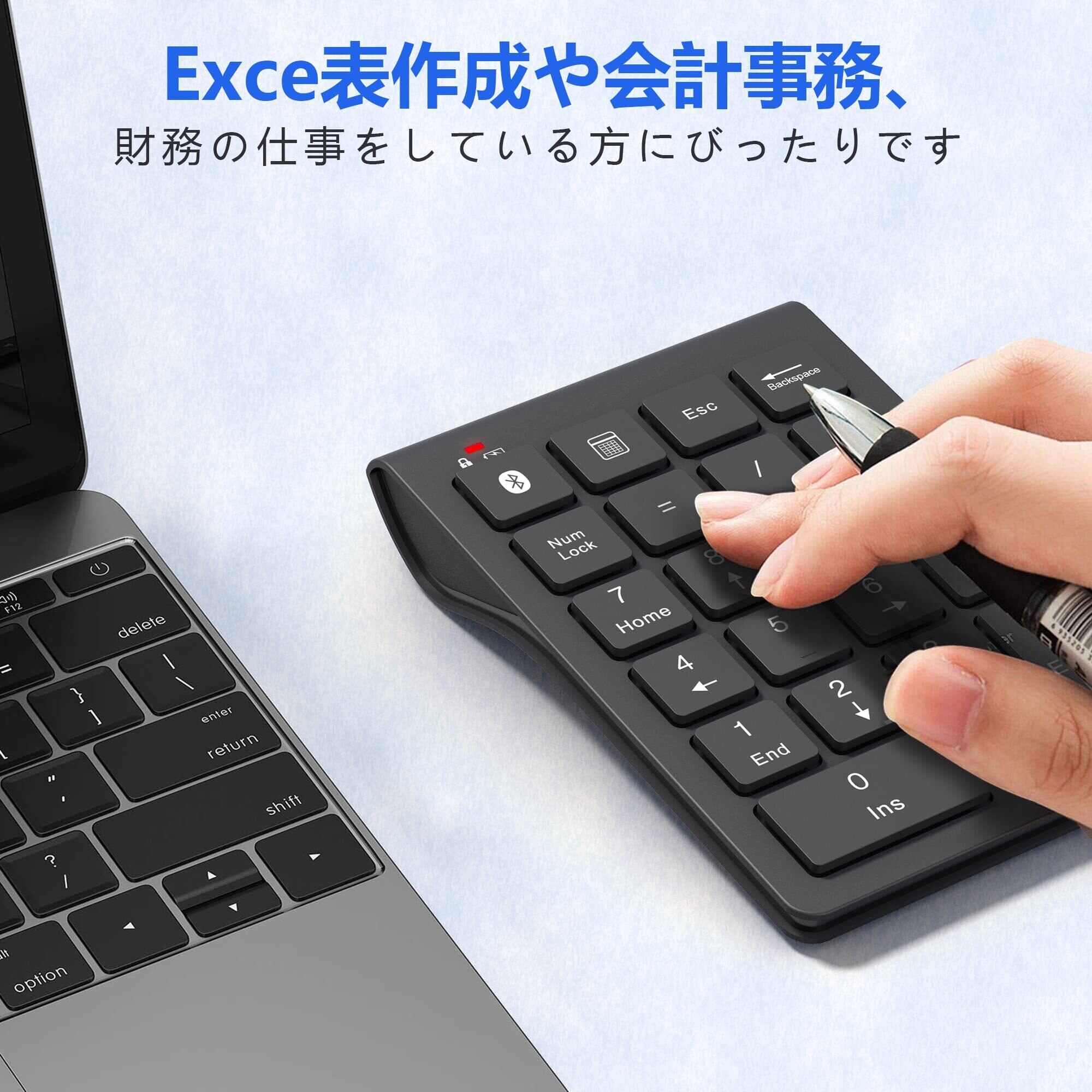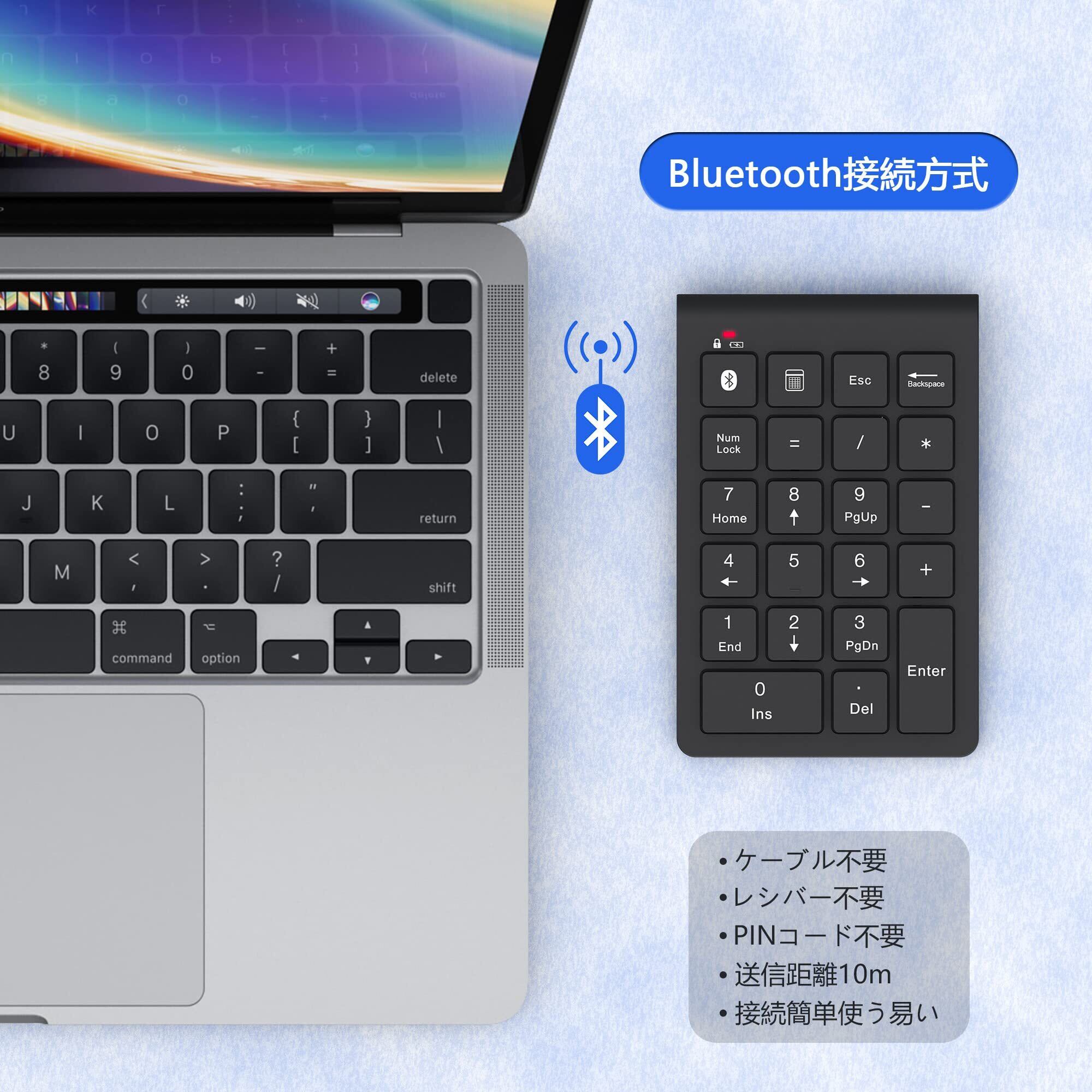 Bluetoothテンキー: 先進的なBluetooth 5.0 機能を搭載し、接続するとすぐ使え、10メートル以内の伝送範囲で、データ転送速度と安定性も大幅アップし、遅延または中断することはほとんどありません。レシーバー不要、PINコードも不要、Bluetooth ボタンを 2 ~ 3 秒間押し続けると、青色LEDが点滅します、 テンキーがペアリングステートに入ることを示します。Bluetoothのワイヤレスレシーバーがついていません、ご了承ください。
