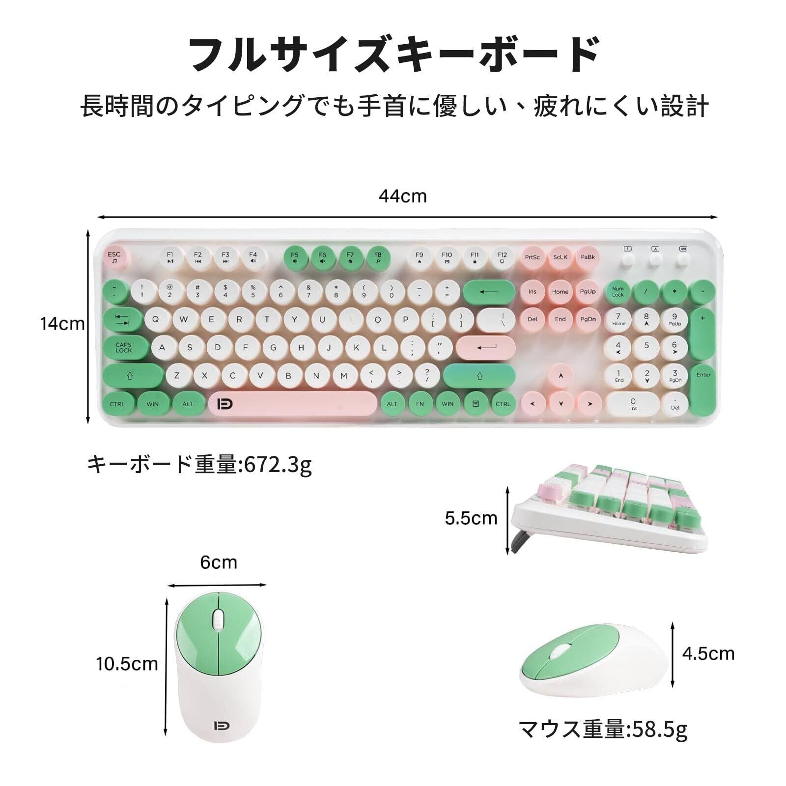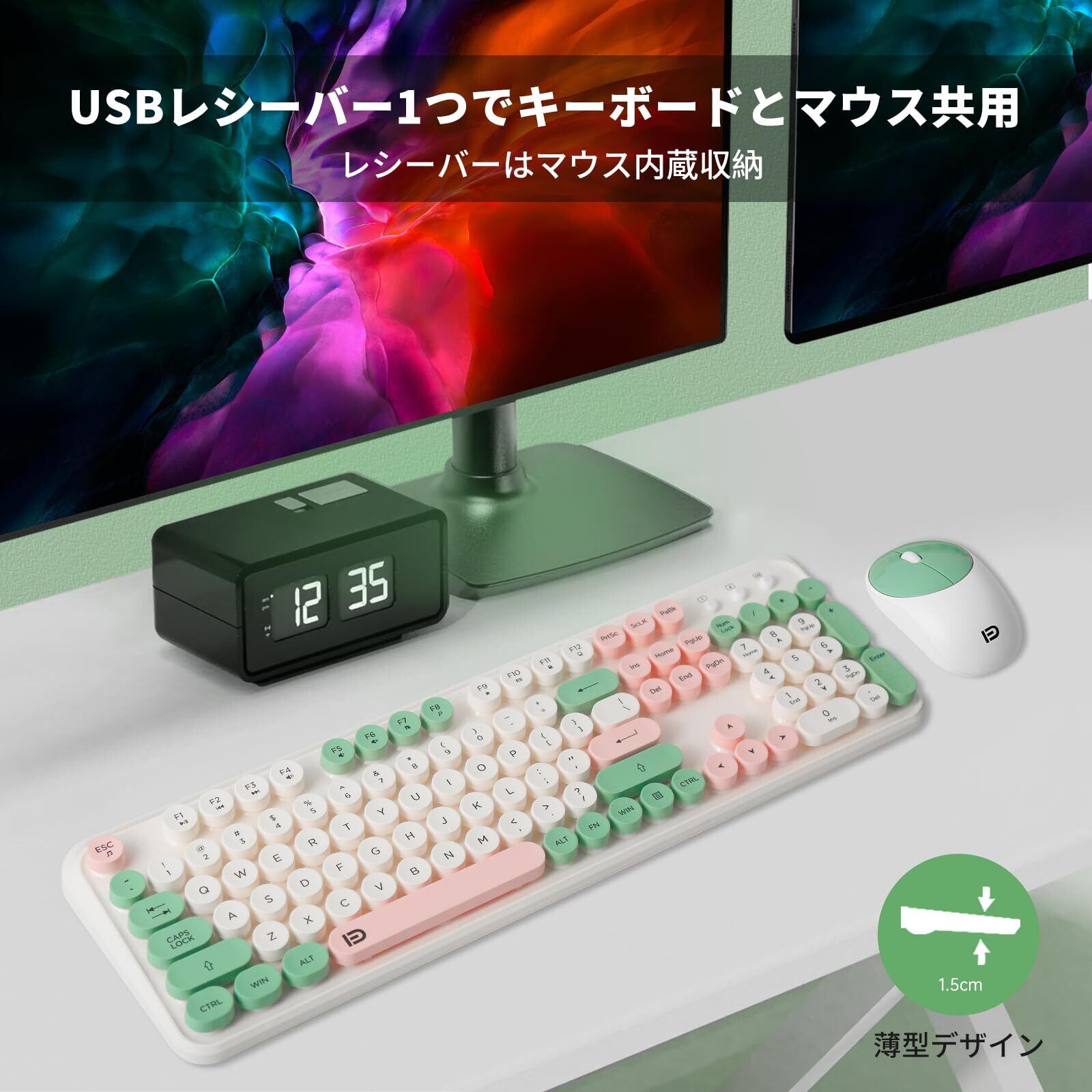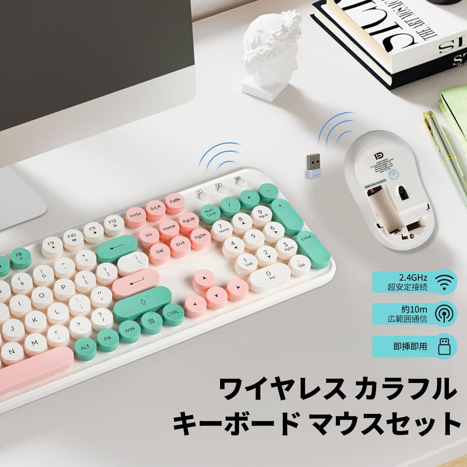 【ワイヤレスキーボードマウスセット】レトロで可愛いデザインのワイヤレスキーボードマウスセットです。105 キーのフルサイズレイアウトでタイピングが快適です。マウスは手にフィットするコンパクト設計で、軽量設計のため、デスク周りをすっきり整理できます。マウス底面に収納された USB レシーバーを挿すだけの簡単接続で、面倒な設定は一切必要ありません。