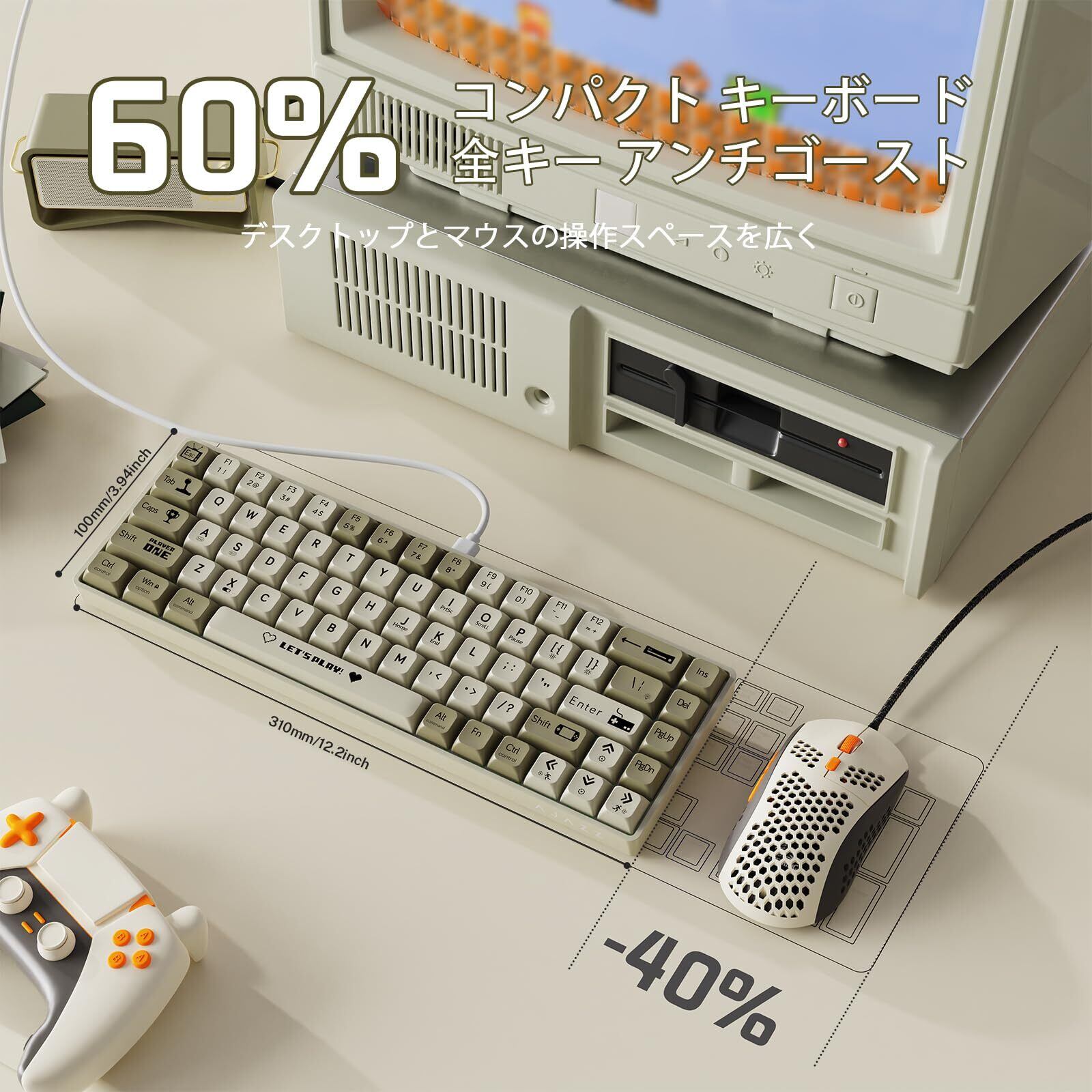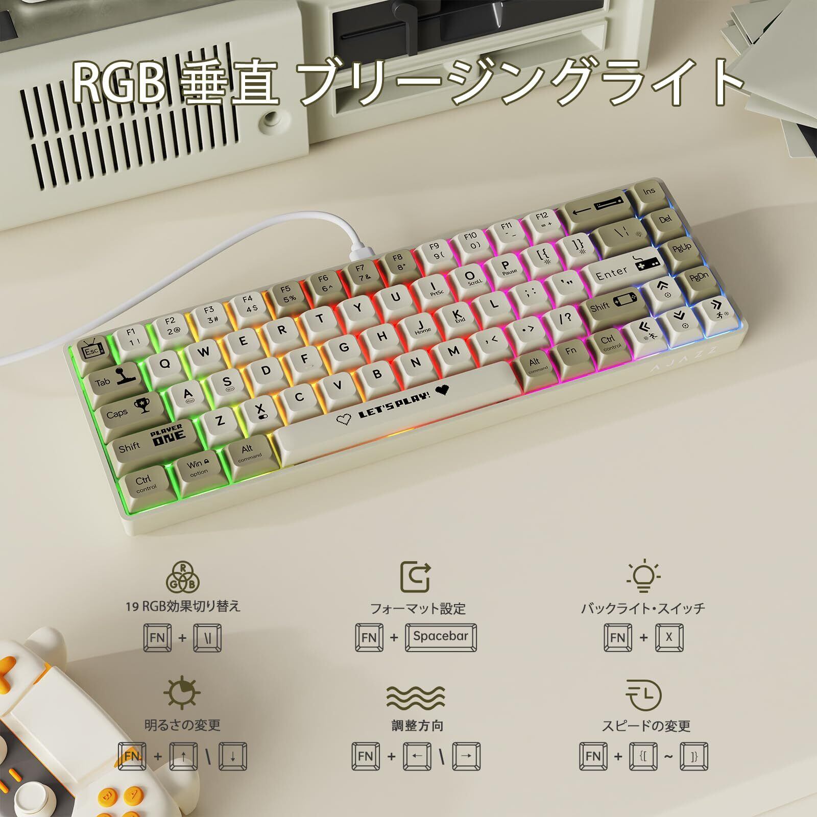 【RGB垂直ブリージングライト&UVスタンプABSキーキャップ】鮮やかで美しい64色のレインボー・カラー・ブリージング・ライトバックライトが、ゲーミングセッションを盛り上げます。切り替え可能な19種類の照明効果をカスタマイズして、ユニークなゲーム環境を作りましょう。キーキャップにはユニークで個性的なキーパターンもプリントされています。UVスタンプ技術とレーザー刻印作らたキーボードのキーキャップの文字は永遠に色褪せず、色あせないホットスタンプ文字で、カラーを長持ちさせます。XDA高さのボールキャップデザインは、派手で斬新なカラーコンビネーションを採用しています。