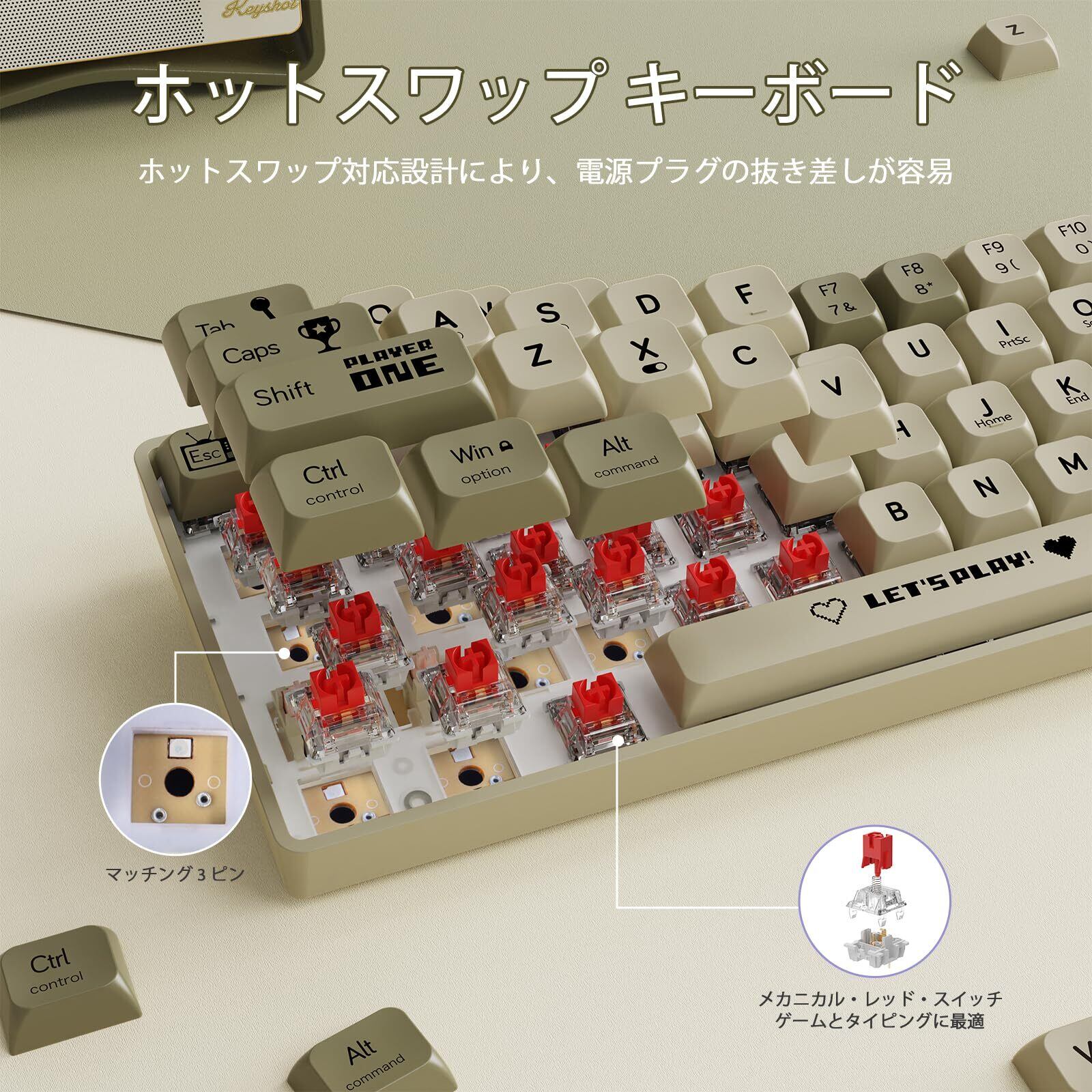 【EVAサンドイッチ消音パッド&アンチゴースト】メカニカルシャフトボディは専用のEVAサンドイッチ制御音響スポンジは、打鍵音をクリアにし、プロ仕様のタイピング体験を実現します。本製品はアンチゴースト機能を備えており、簡単にスイッチを交換できます。3ピンスイッチにのみ対応していますので、ご注意ください。全キーアンチゴースト, すべてのキーが同時に押されても正確に入力します、これでゲームの中で競争力を上げます。高速ゲームプレイでも信頼性と正確性を確保します。対応OS:Windows 2000/XP/7/8/10/11、 VSTA 、Android。