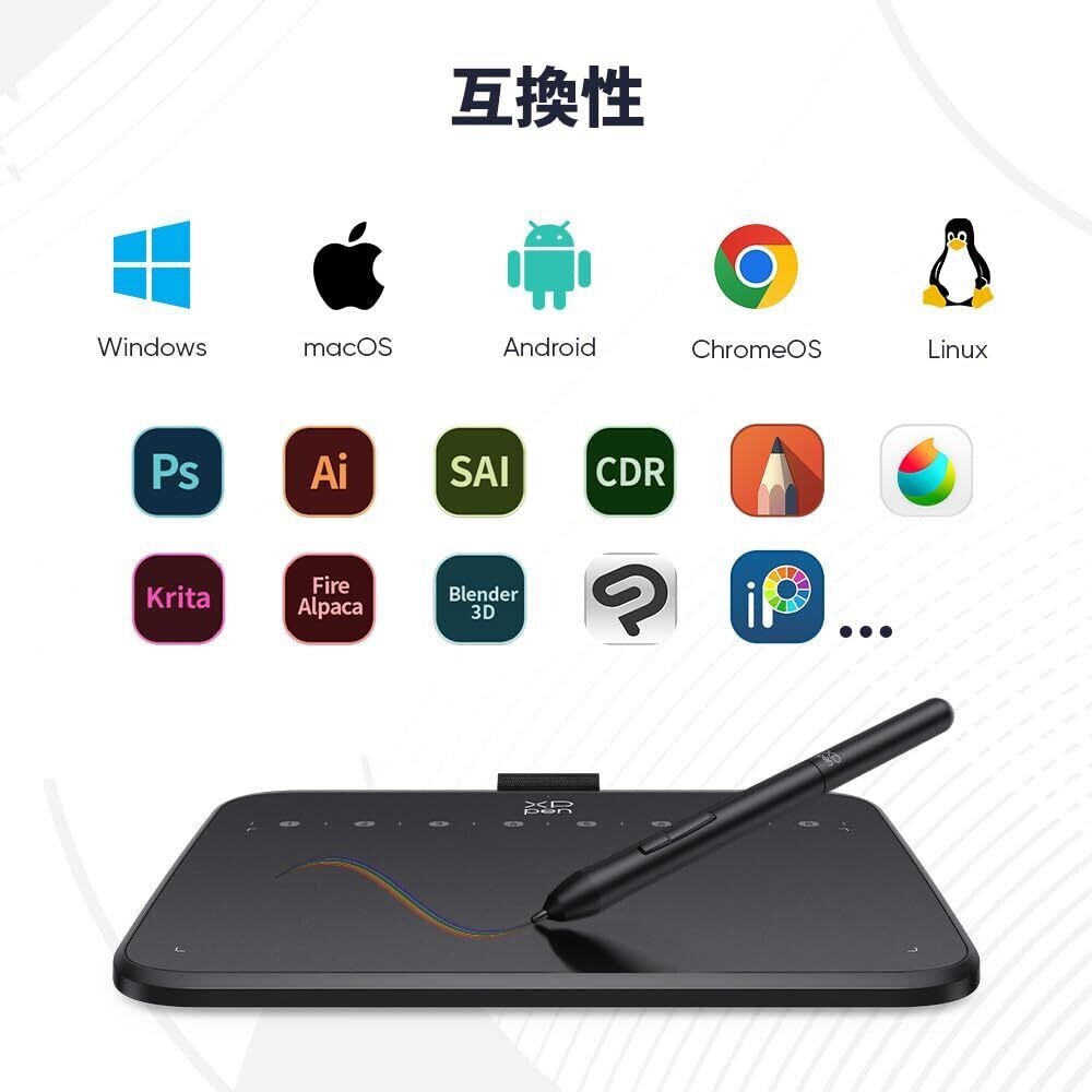 【豊富な互換性】Windows や macOSなどのシステムと幅広く互換性があり、さまざまな主流の描画およびデザインソフトに対応しています。対応OS:Windows 7以降、macOS 10.13以降、Android 10.0以降、Chrome OS 88以降、Linux。対応ソフトウェアパソコン:Photoshop、Illustrator、SAIなどAndroidスマホ/タブレット:MediBang Paint、アイビスペイント、OneNoteなどです。