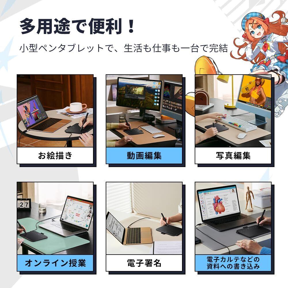 【コンパクト・多用途】手描きタブレットとしてだけでなく、薄くて軽いため、デジタルノートとしても使用できます。教室やオフィスでも、自由に創作できます。アニメや動画制作、写真編集、イラスト、デザイン、オンライン授業など様々な場面で、活用できるペンタブレットです。