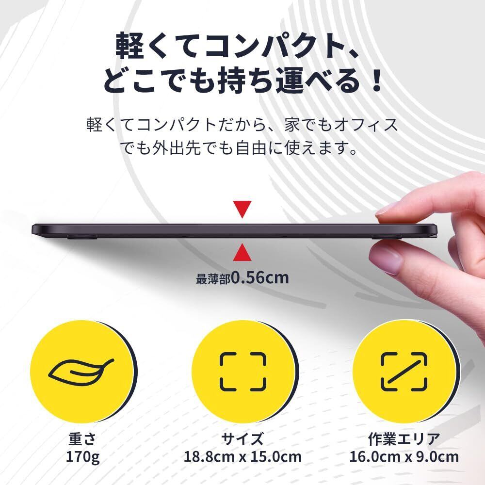 【手頃なサイズ・繊細な描画】Deco 640板タブの寸法は149.96 x 188.34 x 7.7mm。8192レベルの筆圧感知により、同時に、60°傾き検知に対応することで、影のストロークや豊かな線のバリエーションを簡単に描け、まるで紙に描くように、タブレットで自由に描きやすくなります。