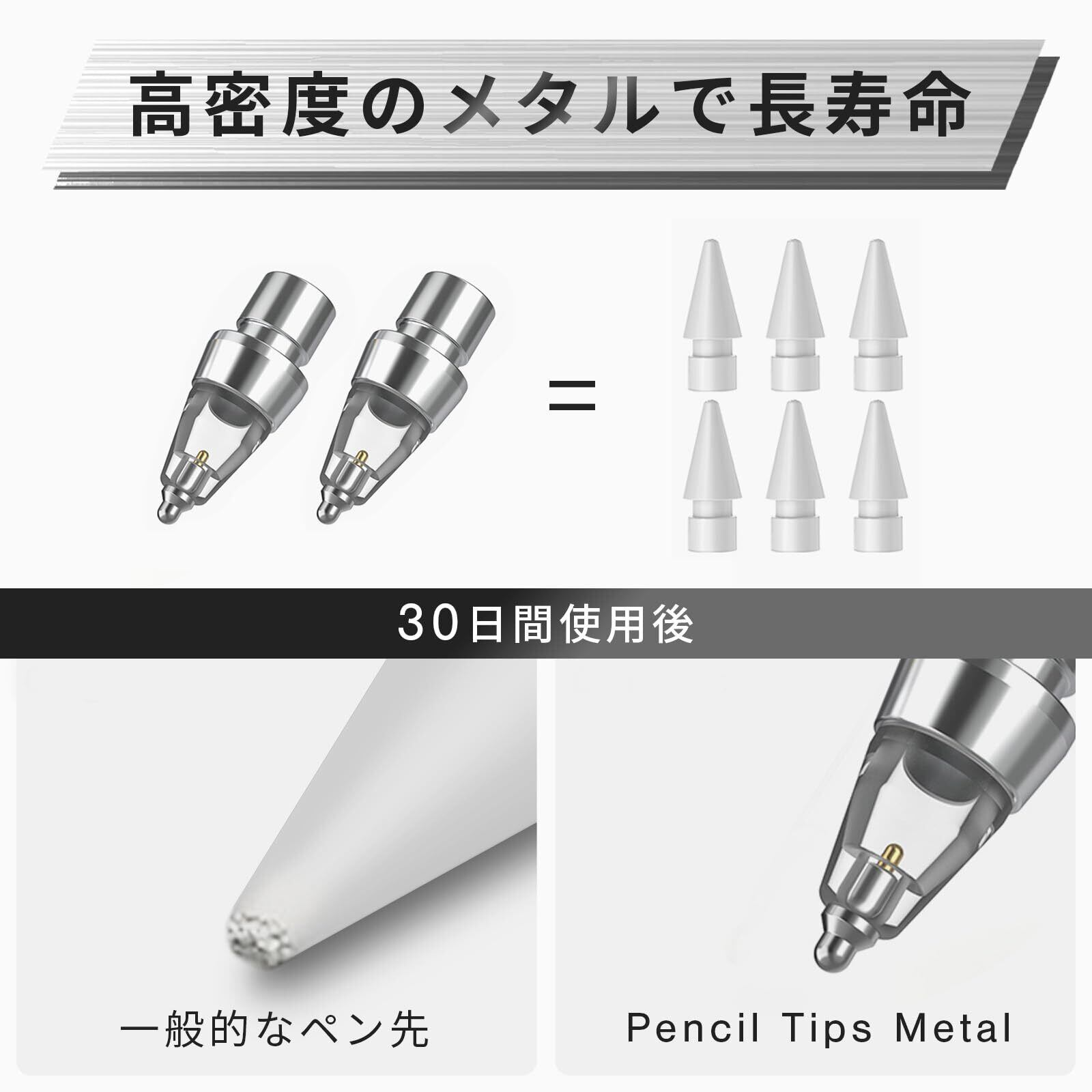 【新時代のメタル製】特殊素材を使用し、「滑らかさ」と「耐久性」を両立したApple Pencil専用ペン先です。
