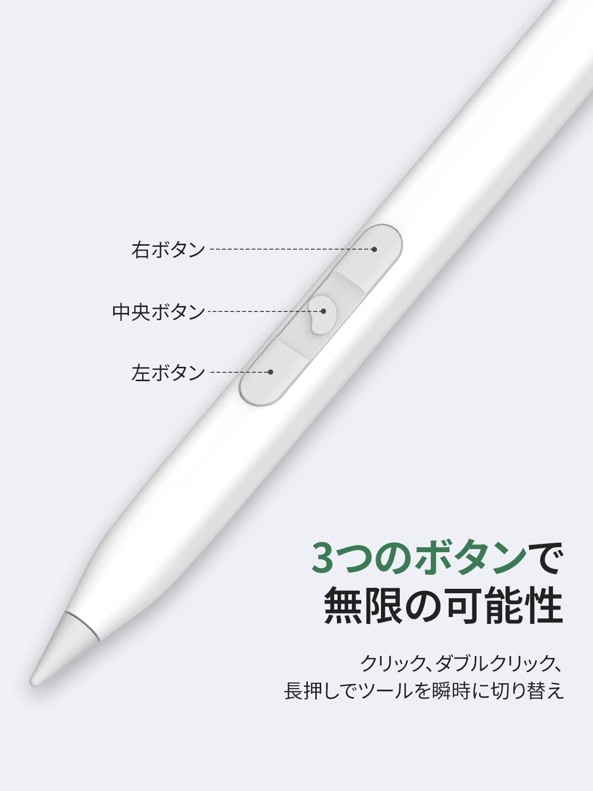 9つの多様なショートカット:3つの直感的なボタンで、GoodnotesとProcreateの9つの機能を操作できます。iPad上のメニューをタッチすることなくイラスト、消去、ハイライトができます。(クイックボタン機能にはBluetooth接続が必要です。)