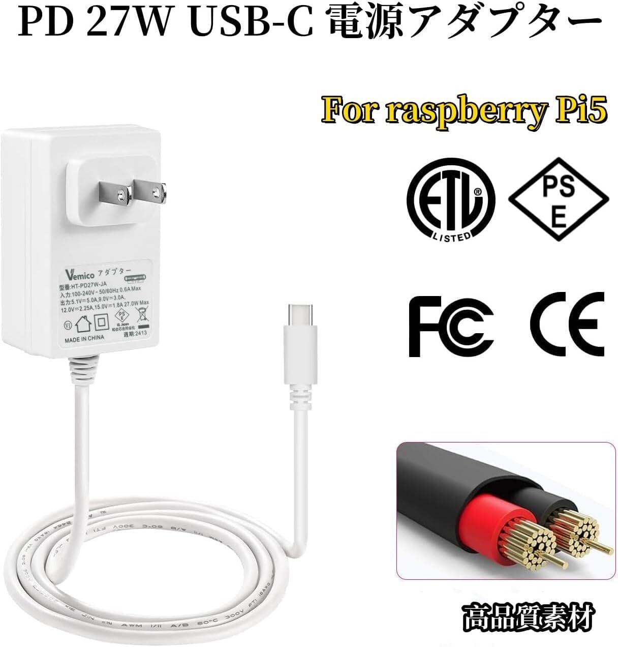 【Pi5 PD電源規格】Raspberry Pi5 PD電源アダプター:入力:AC100—240V(PD対応) 50/60Hz;出力: 5.1V/5A、9V/3A、12V/2.25A、15V/1.8A (電力供給);ケーブル長:1.2M;タイプ:PD-27W USB-C;色:白。Raspberry Pi 5に対応。Raspberry Pi 5電源は耐久性と高温耐性のある素材を使用しているので、高い充電効率と優れた放熱性を備えています。PSE認証により、先進的な電気回路と内蔵の安全装置を備えており、短絡保護、過熱保護、過負荷保護、過電流保護、過電圧保護を提供して、お使いのraspberry Piを多方面から保護します。