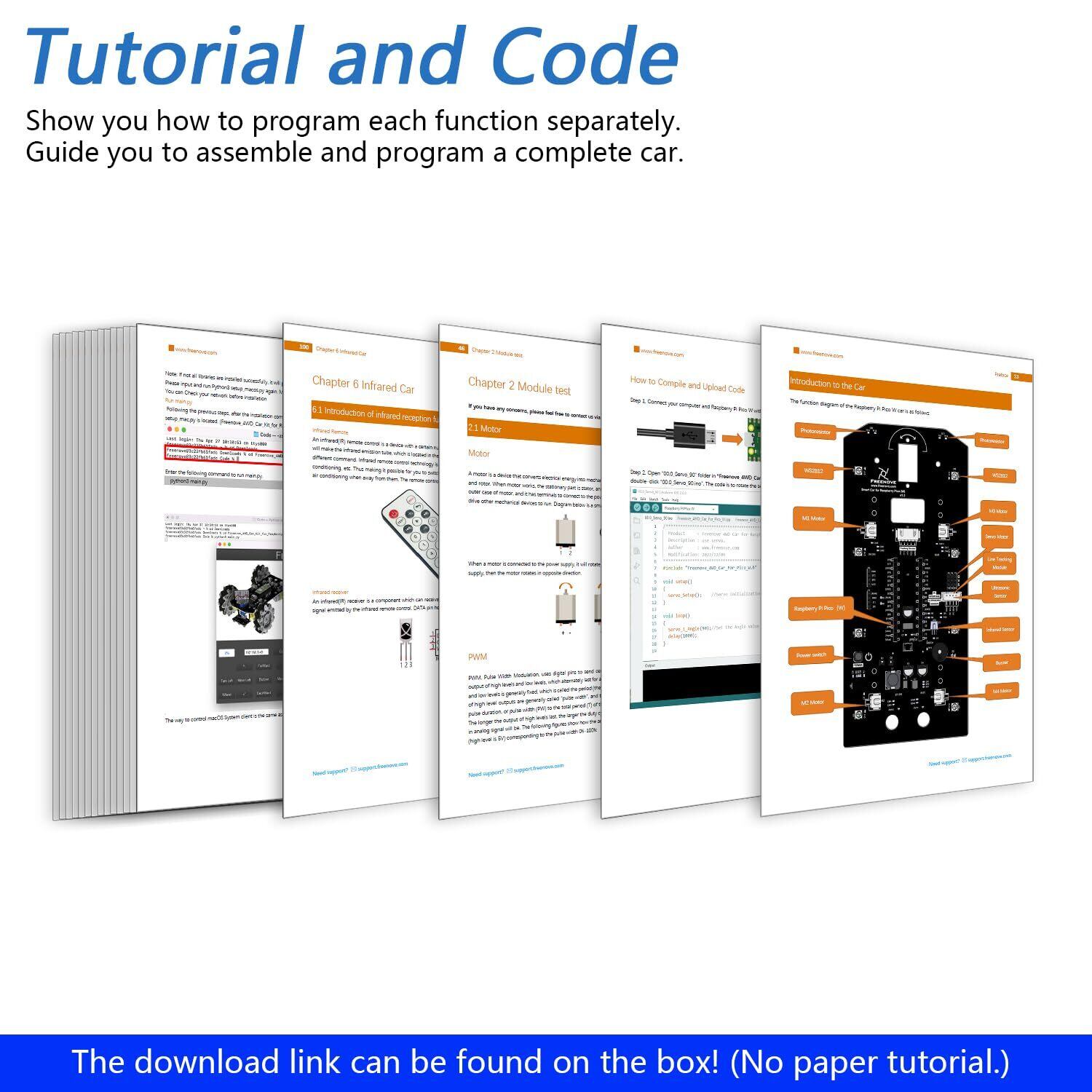 ステップバイステップの組み立てチュートリアルと完全なコードを提供します -> ダウンロード リンクは製品の箱にあります (紙のチュートリアルはありません。英語のみ)。