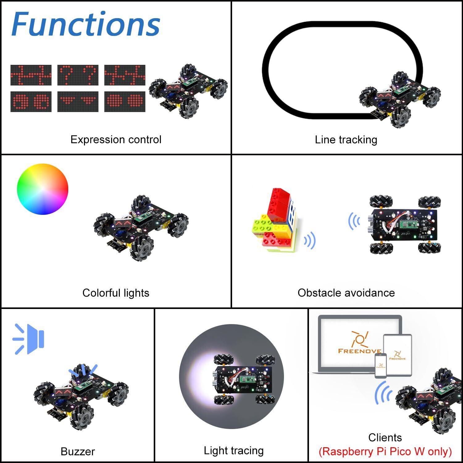 Freenove Mecanum ホイール カー キット Raspberry Pi Pico W 用 (付属) (Arduino IDE と互換性あり)、ドット マトリックス表現、障害物回避、ライン トラッキング、ライト トレース、カラフルなライト、アプリ