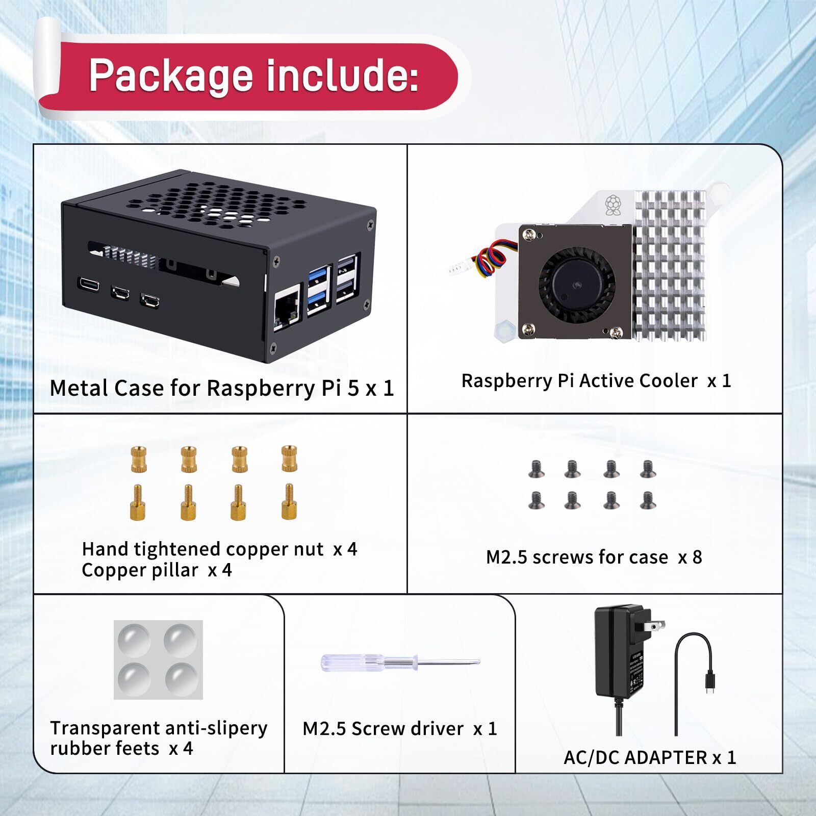 【パッケージ内容】Raspberry Pi 5用メタルケース1個、公式Raspberry Pi 5アクティブクーラー1個。 Raspberry Pi 5 用 27W 電源 x 1; 1x ネジパック、1x 4 個のゴムパッド; ドライバー1本。 ご注意ください: Raspberry Pi ボードはパッケージに含まれていません。