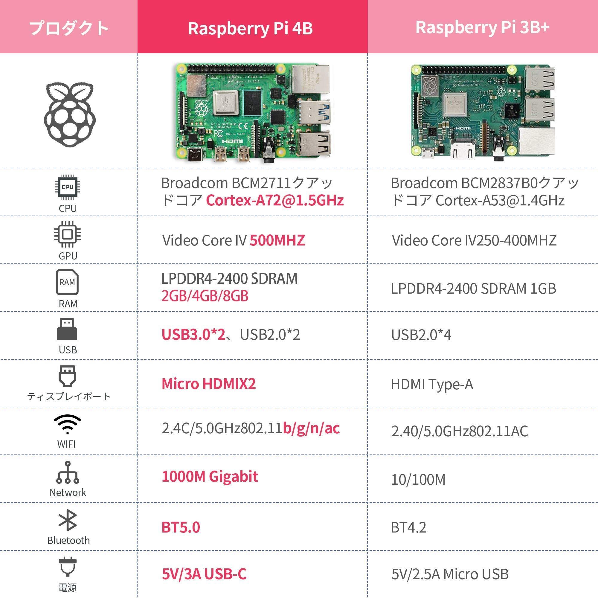 最新のRaspberry Pi 4B(建築設計承認:007-AH0184)は、従来モデル「Raspberry Pi 3 Model B+」のプロセッサとI/Oを大幅に強化した製品です。SoCとして最大1.5GHz動作のCortex-A72クアッドコアを採用、従来と比較してBCM2711は2~4倍の性能向上を果たし約50%以上高速化しました。グラフィックスはVideoCore VIが最大500MHzで動作し、OpenGL ES 3.xをサポートします。I/O面では4Kのデュアルディスプレイ出力を新たにサポートし、映像出力端子がType-D 2個に変更されました。その他、USB 3.0やBluetooth 5.0に対応し、ギガビットイーサネットも従来モデルから高速化されています。これは今まで最も速いRaspberry Piで、x86 PC入門システムと匹敵できるものです。