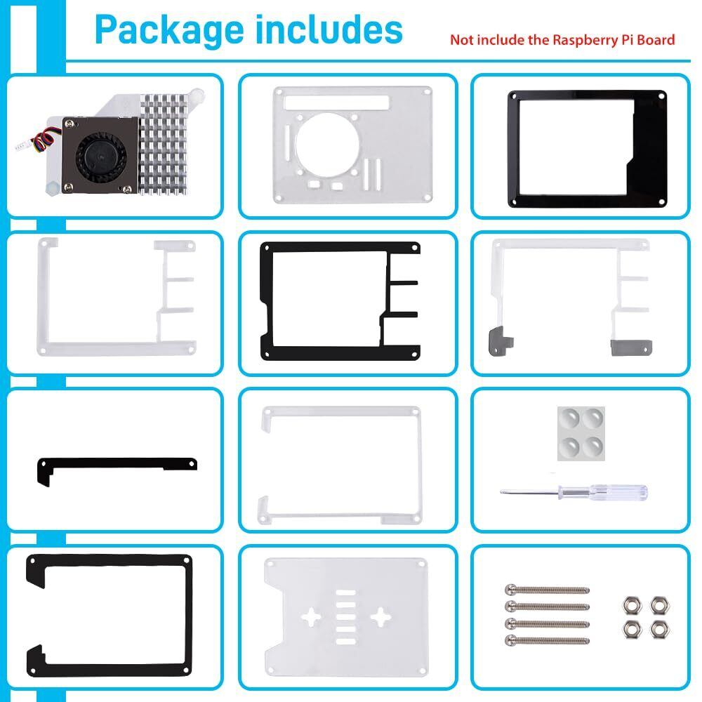パッケージ内容:Raspberry Pi 5用アクリルケース1個、公式Raspberry Pi 5アクティブクーラー1個、ドライバー1個。