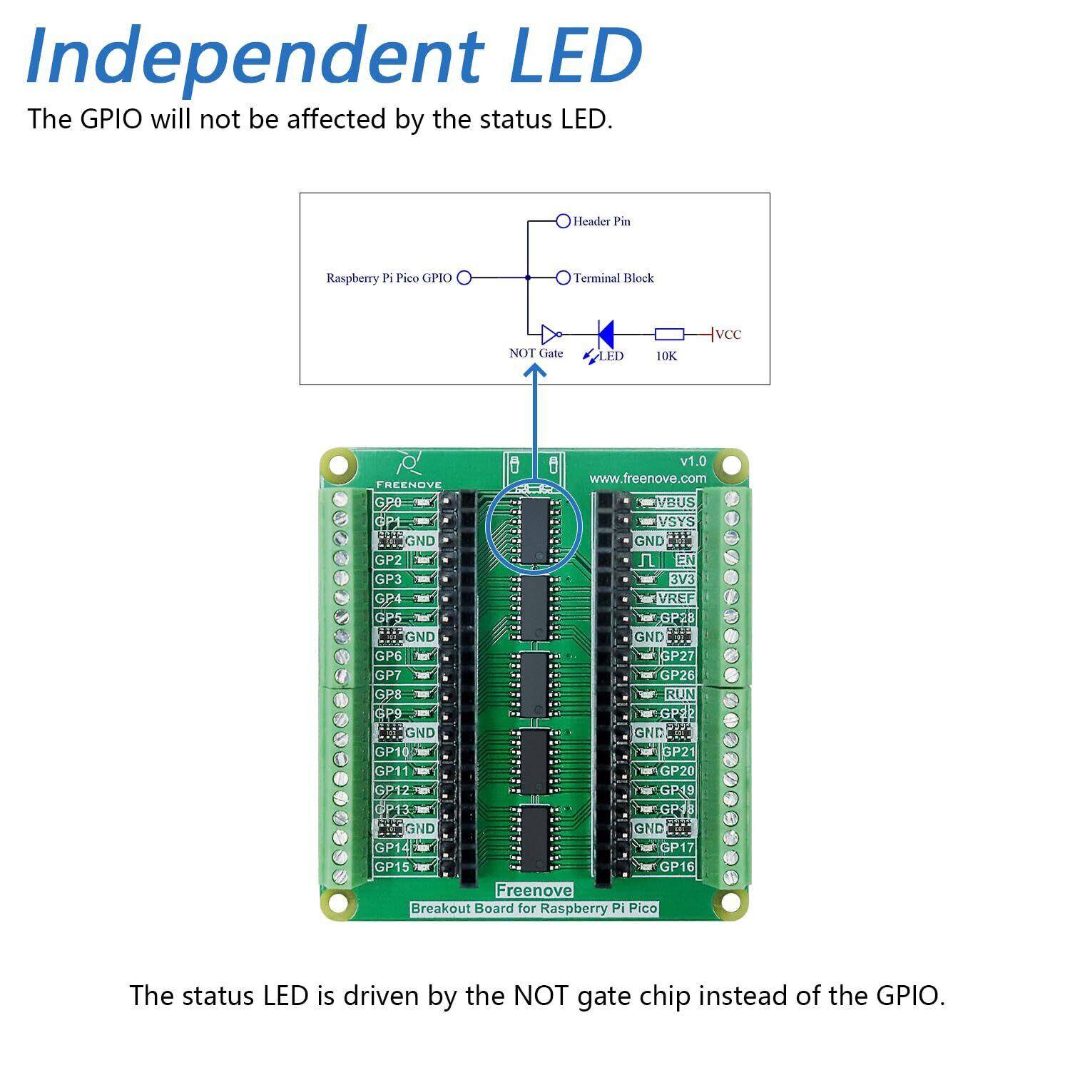 Freenove Raspberry Pi Pico 1/2 W H WH用ブレイクアウトボード、端子ブロックシールドHATピンヘッダー、GPIOステータスLED