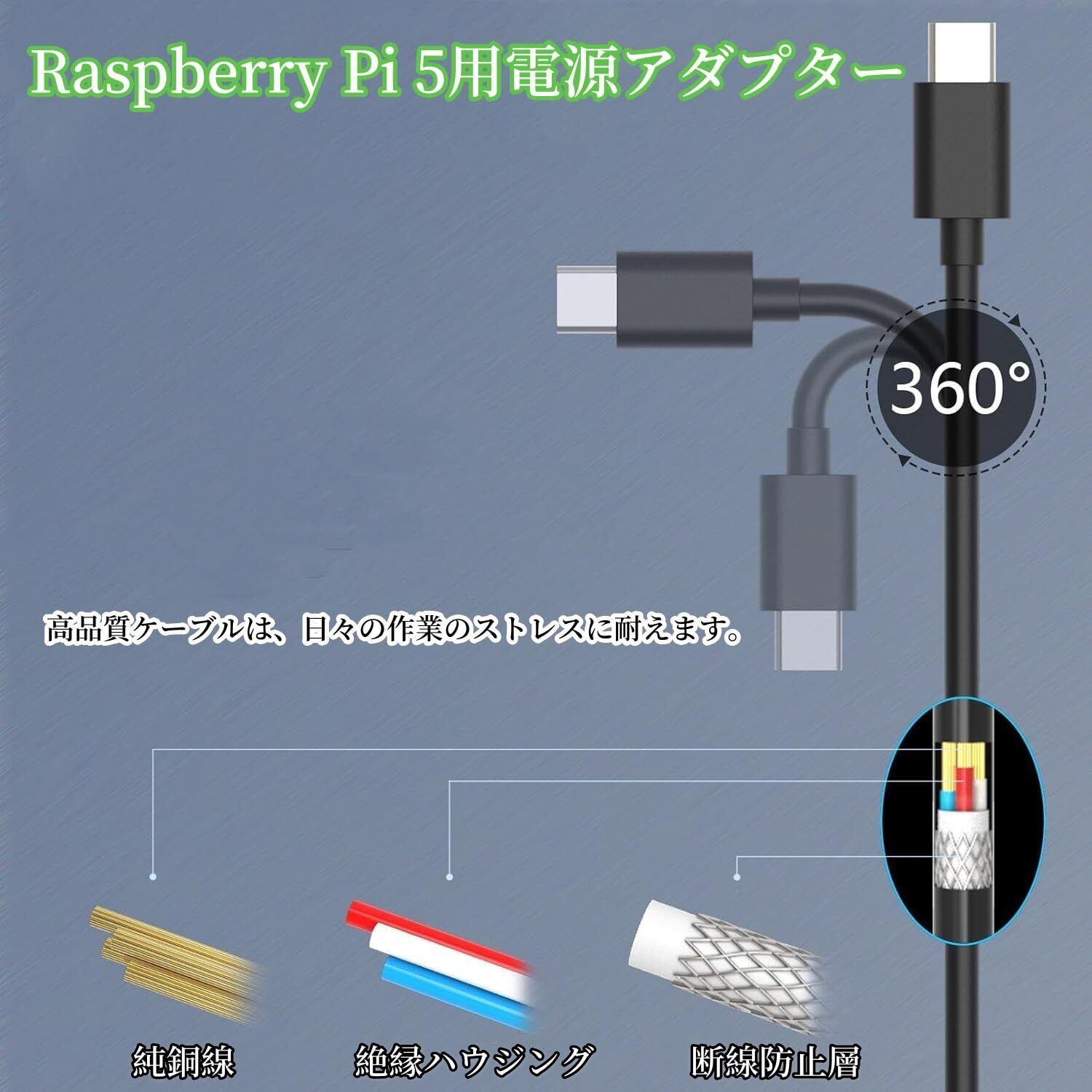 【効率的に電源を提供】Raspberry Pi 5のような電力消費の大きな機器を接続すると、ケーブルの抵抗も電圧降下の原因になります。そのためケーブルの長さを少し短めの1.2mにしました。多くのPi5ユーザがフル負荷稼働時にPi5のシャットダウンやフリーズの現象に悩まされません。
