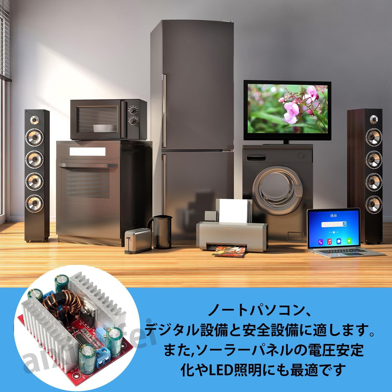 【安定供給】最適なエネルギー変換で安定した電力供給を実現このDC-DC昇圧コンバータは、入力8.5V-50Vを出力10V-60Vに安定変換し、最大15Aの入力と12Aの出力を実現。高効率で最大変換効率は96%で、電圧差の影響を最小限に抑え、安定した電力供給をします。