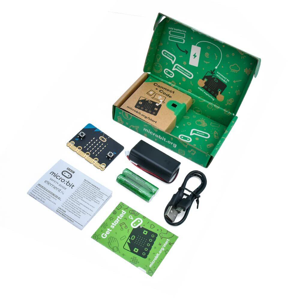 パッケージ内容: micro:bit v2.2ボード x 1、micro USBケーブル x 1、バッテリーホルダー x 1、AAA電池 x 2、クイックスタートガイド x 1。