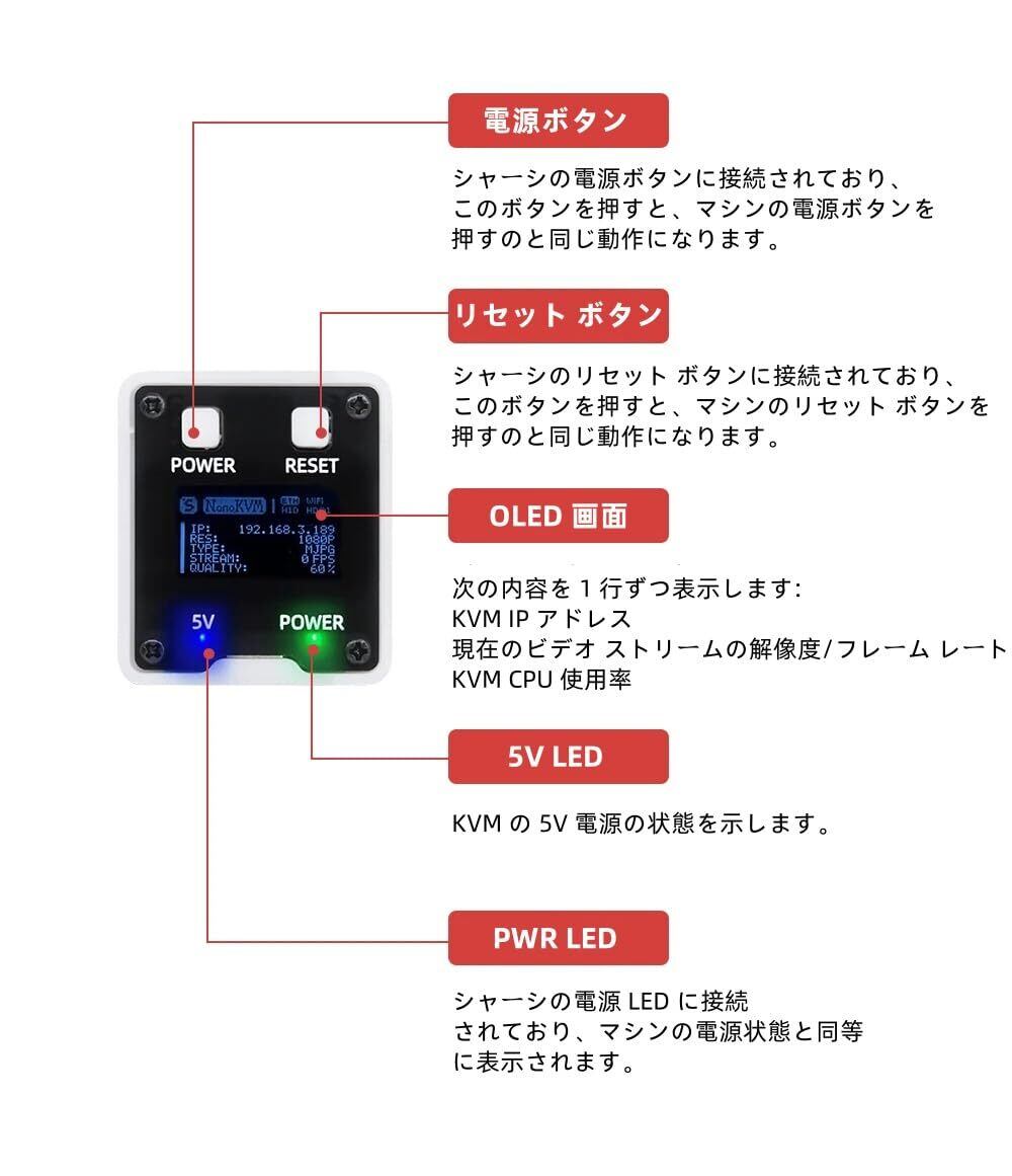 NanoKVM には、コンピュータによってモニタとして認識され、コンピュータ画面をキャプチャできる HDMI 入力インターフェイスが含まれています。USB2.0 インターフェイスはコンピュータ ホストに接続され、キーボード、マウス、タッチパッドなどの HID デバイスとして認識できます。同時に、TFカードの余剰ストレージスペースが使用され、USBフラッシュドライブデバイスとして取り付けられます。シリーズ全体には、ビデオおよび制御信号のネットワーク送信に使用される100Mネットワークポートが標準装備されています。 。さらに、フル バージョンには、ホストの電源オン/オフ ステータスをリモート制御および表示するための ATX 電源制御インターフェイス (USB-C 形式) も備わっています。また、フル バージョンには、ローカル IP およびローカル IP を表示するための OLED ディスプレイもあります。 KVM関連のステータス。
