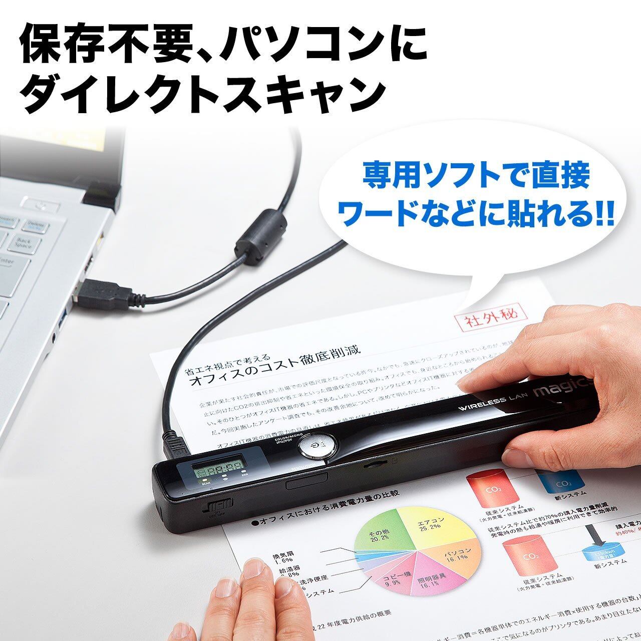 付属ケーブルと専用ソフト「Magic Scan」を使用すれば、保存不要でExcelやWordなどに直接貼り付け可能。