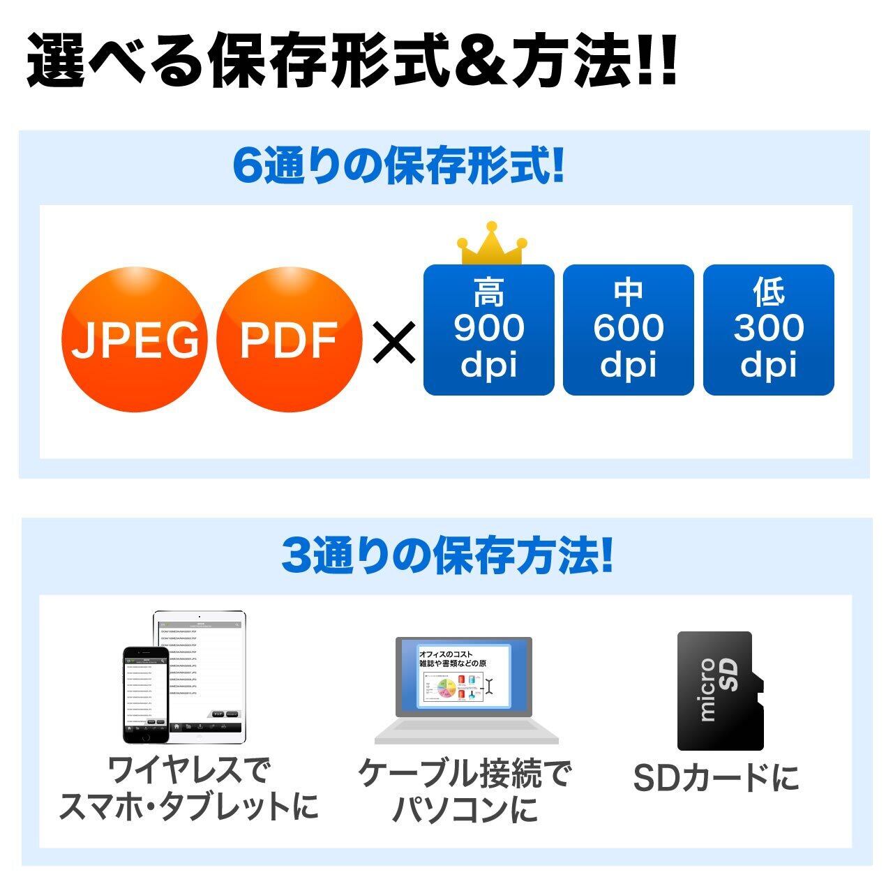 対応フォーマットは「JPEG」・「PDF」形式で、900dpi/600dpi/300dpiより選択可能。(※2)