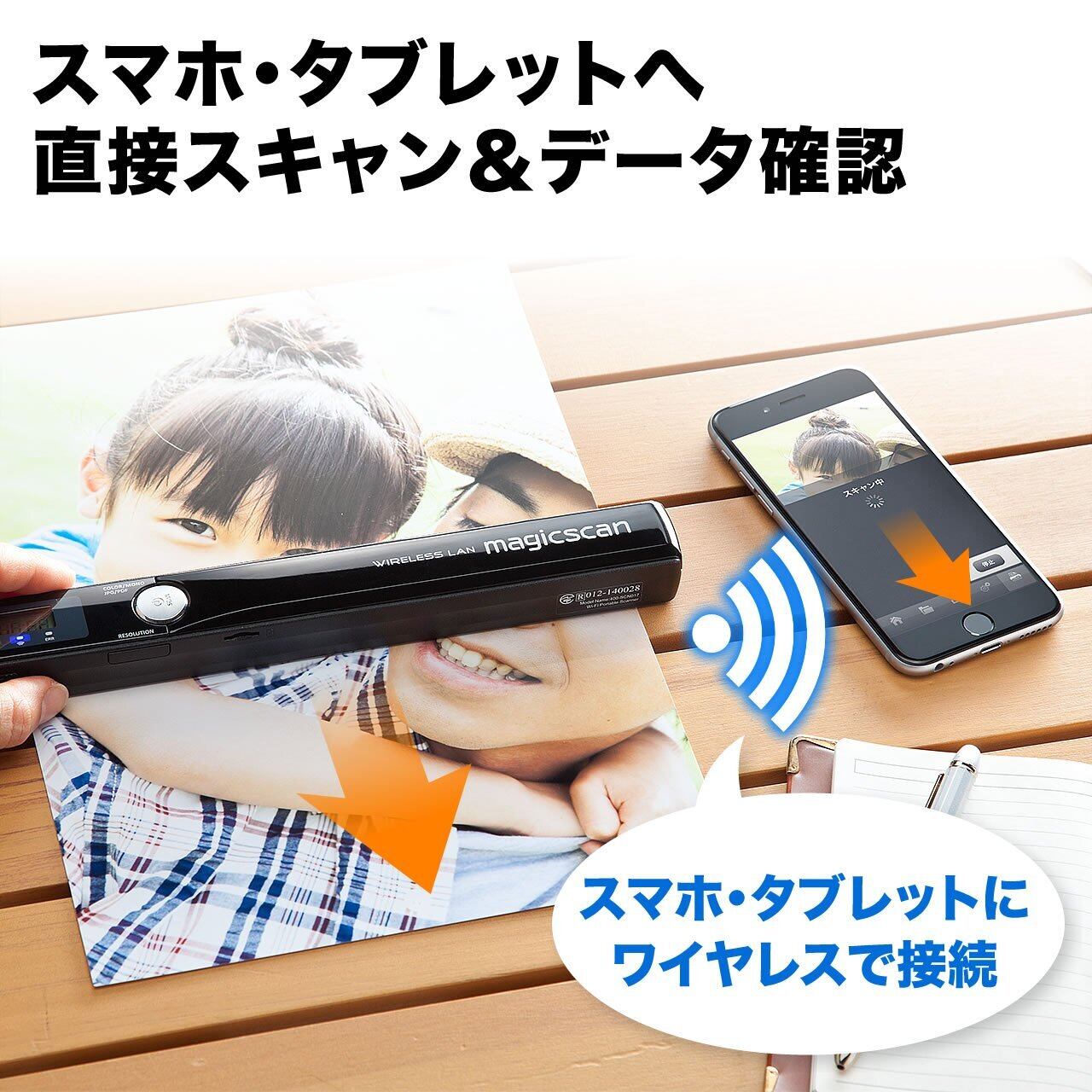 原稿をデータ化し、ワイヤレスでiPhoneやスマートフォン、タブレットに直接転送できるワイヤレススキャナ。(※1)
