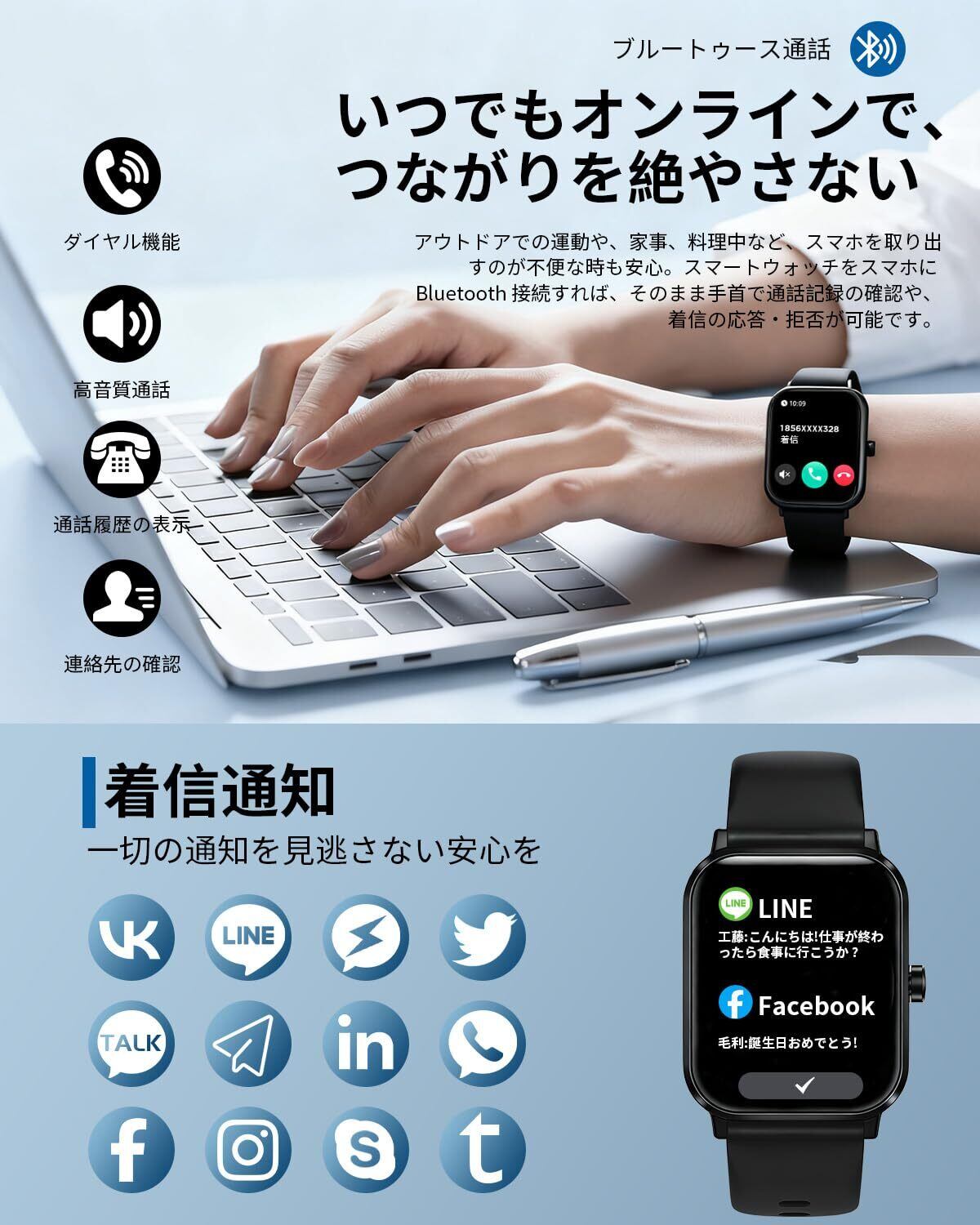 【スマートな通知で連絡を見逃さない】最新Bluetoothを搭載し、安定した高速接続を実現。電話の応答やメッセージの確認を手元で快適に行えます。大切な連絡をいつでもキャッチし(LINE、Facebook、Instagram)、スマホを取り出す手間を軽減。仕事や運動中にも便利です。
